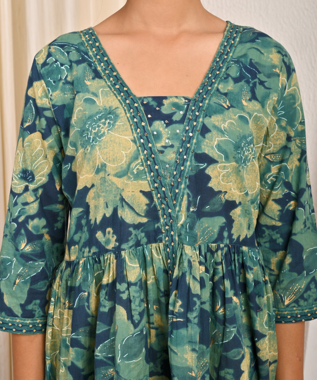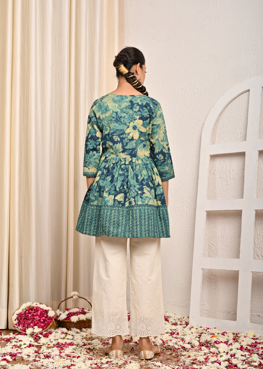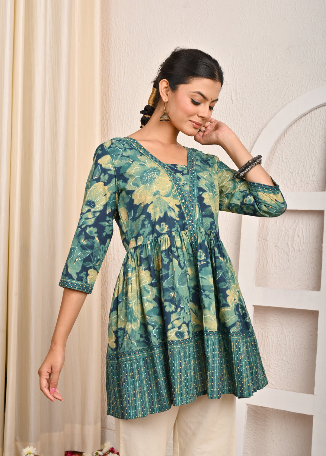 Abstract Floral Printed A-Line Pleated Short Cotton Kurti - Green
