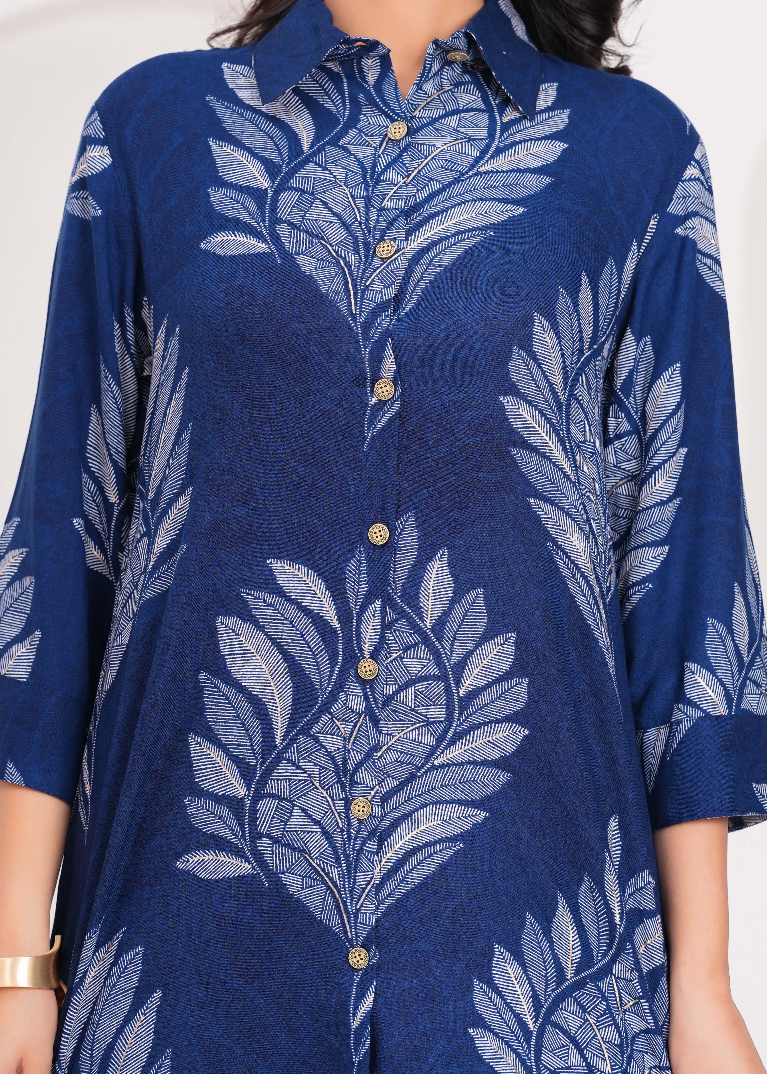Make a bold statement with this vibrant Blue Abstract Floral Printed Co-ord Set, designed for standout style and ultimate comfort. Crafted from soft, flowing viscose rayon fabric, this set offers a beautiful drape that moves with you. The top features a sophisticated shirt collar and a classic button-down style, adorned with an eye-catching abstract floral print in contrasting white and blue hues. This gorgeous piece is perfectly paired with matching straight-fit pants, creating a dynamic, cohesive look. Ideal for both casual outings and stylish leisurewear, this set offers effortless, ready-to-go fashion.