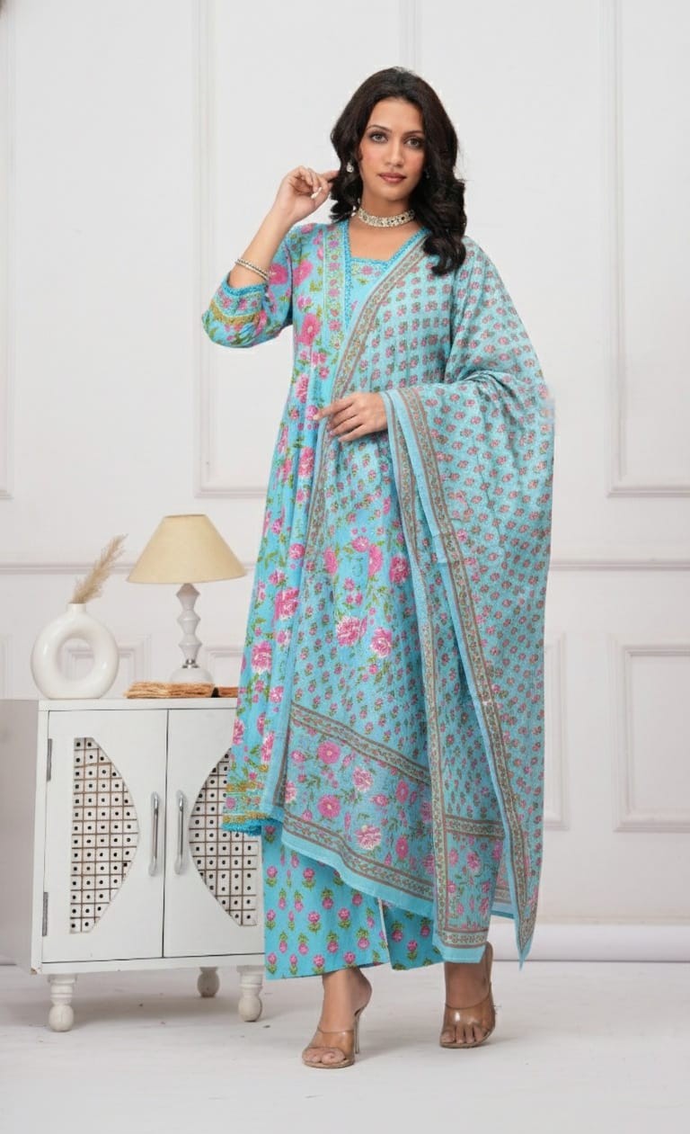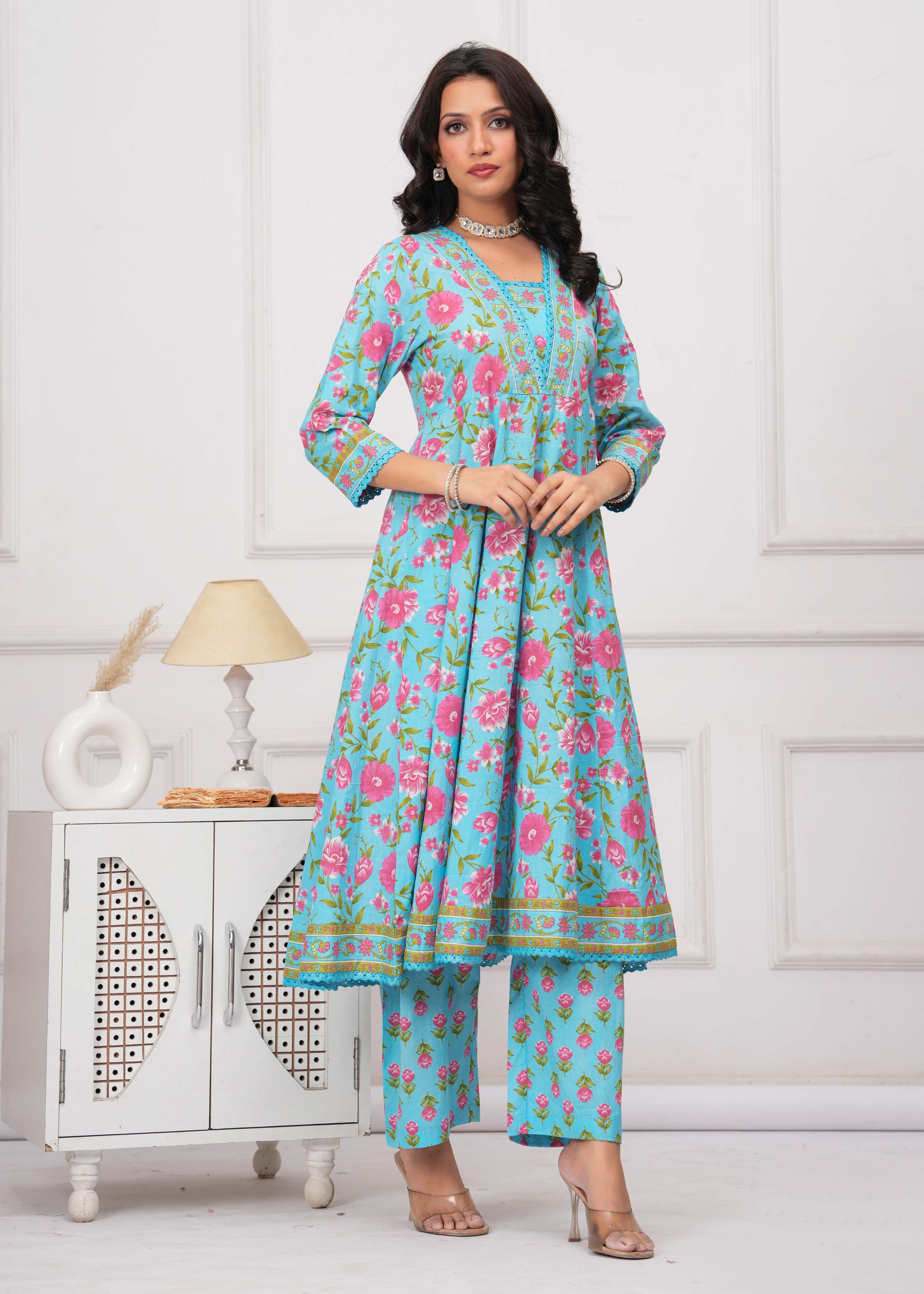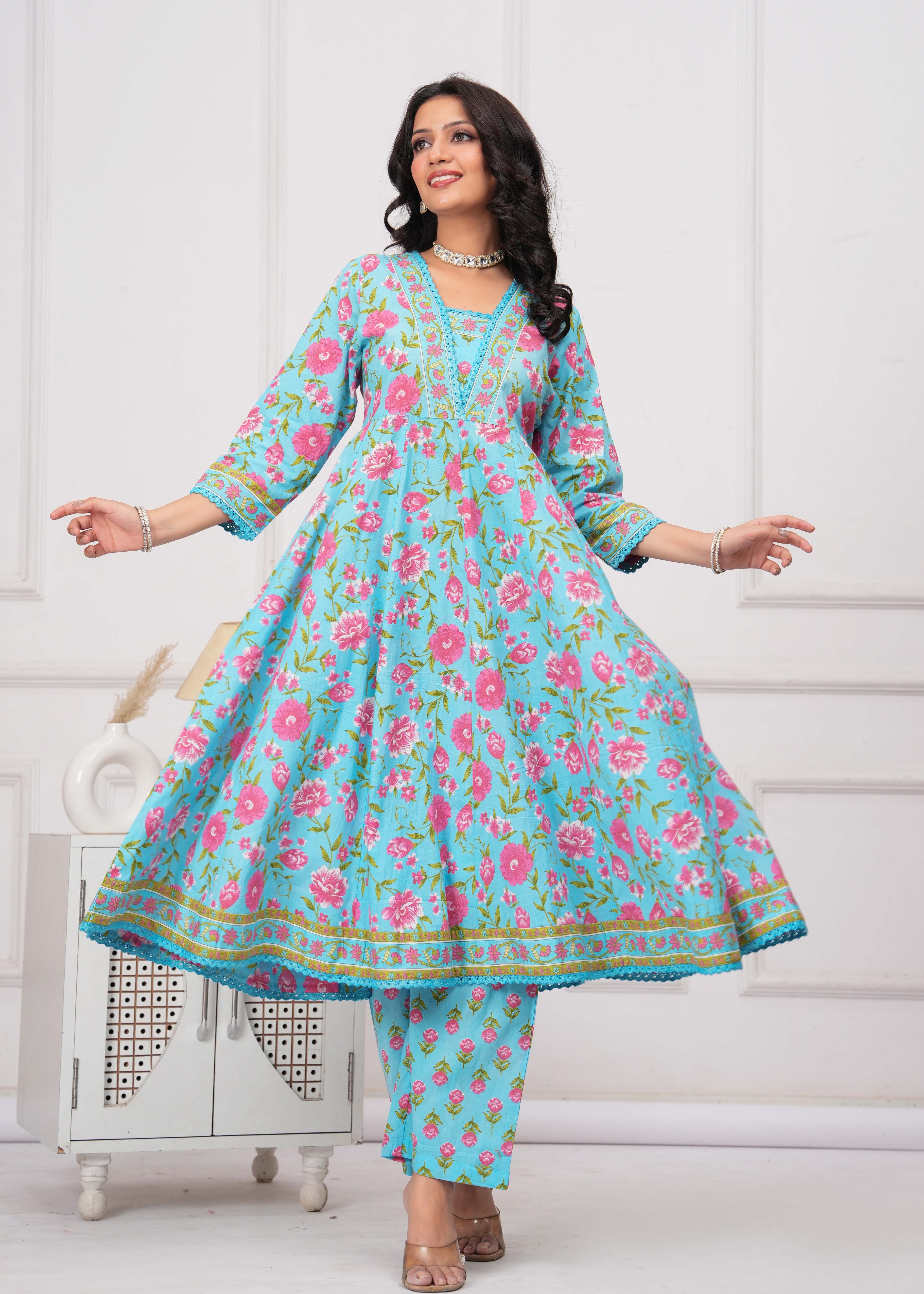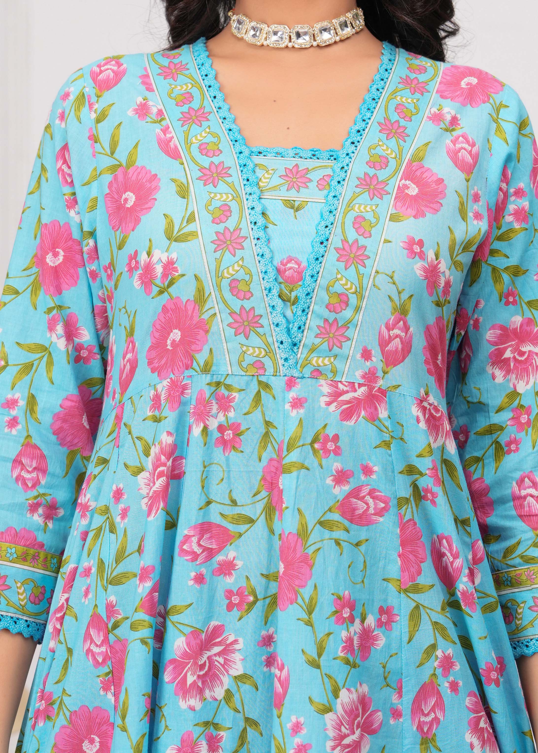 Radiate joyful elegance with this exquisite Anarkali Kurta and Palazzo Set, designed for a flattering fit and dynamic movement. This two-piece ensemble is perfect for sophisticated daytime events and festive celebrations. The set features a graceful Anarkali Kurta, renowned for its flared silhouette, and is captivatingly adorned with vibrant Ethnic Floral Prints all over in shades of hot pink, leaf green, and sunny yellow set against a cheerful sky blue base. It boasts a refined V-neckline beautifully finished with delicate Crochet Lace Detailing in a contrasting teal hue, adding a charming, artisanal border. The flowing kurta is perfectly Paired with Palazzo Pants in a complementary print and Pure Cotton Printed Dupatta, featuring matching floral motifs which adds a final touch of artistic color and luxury to the complete outfit.