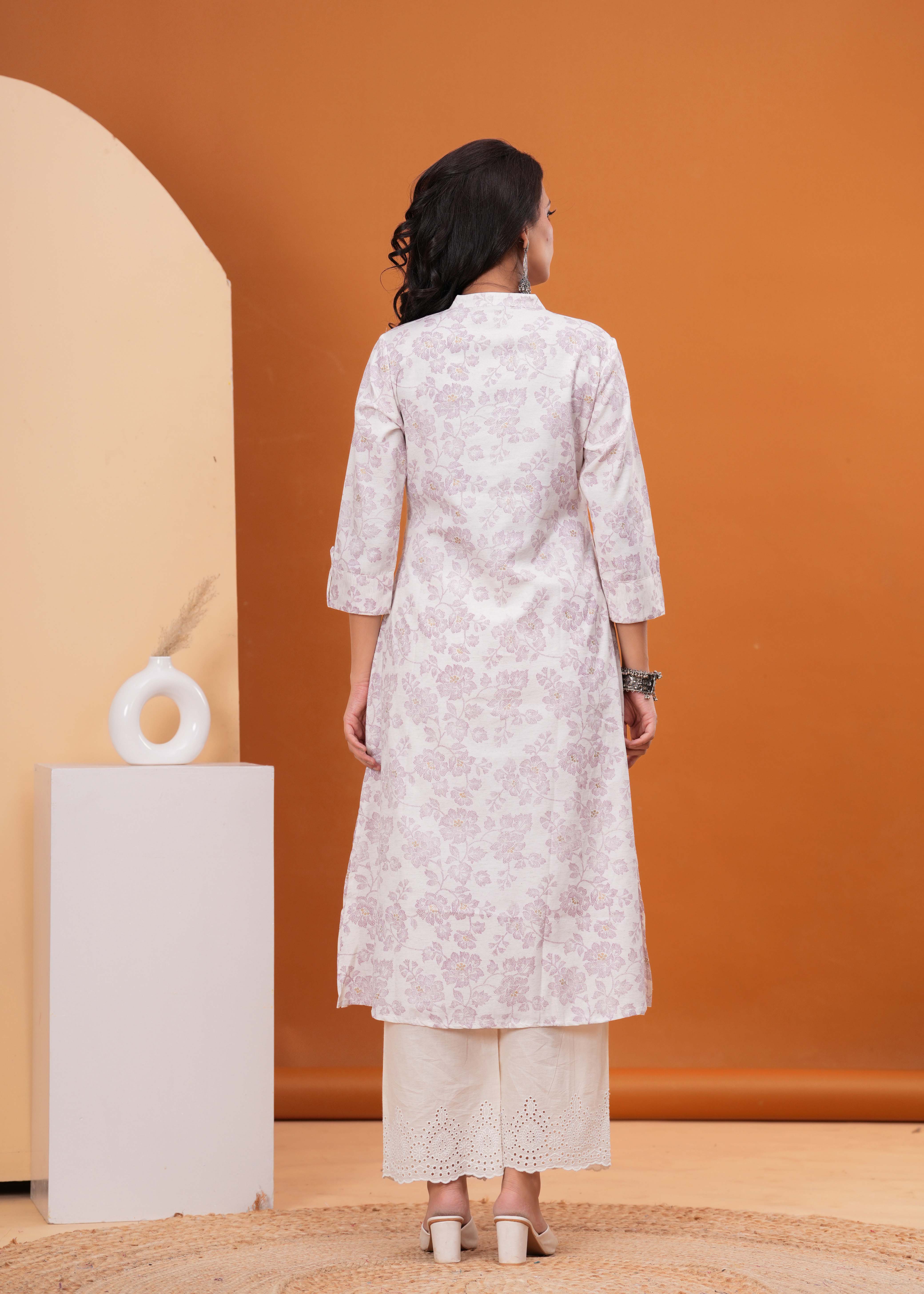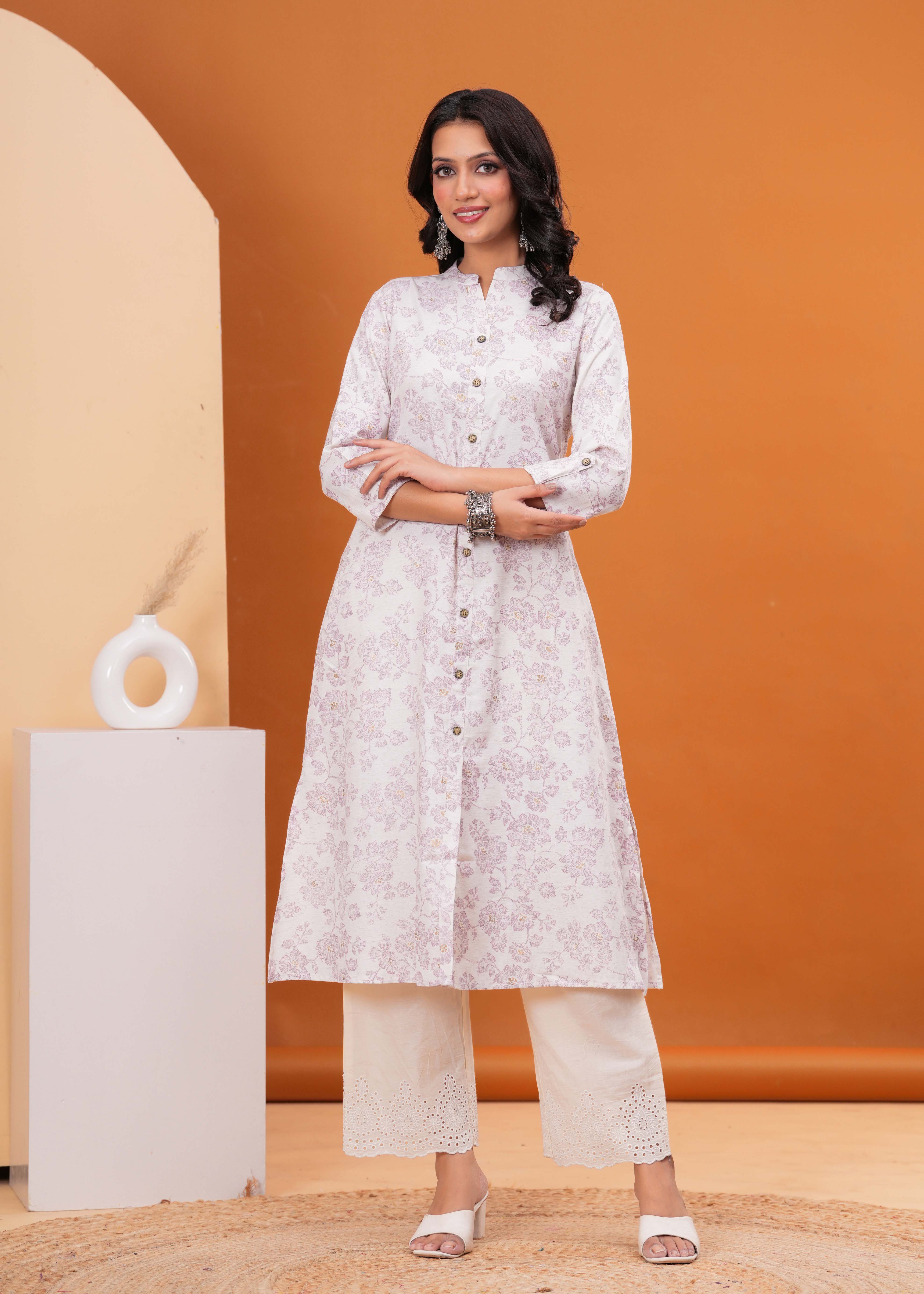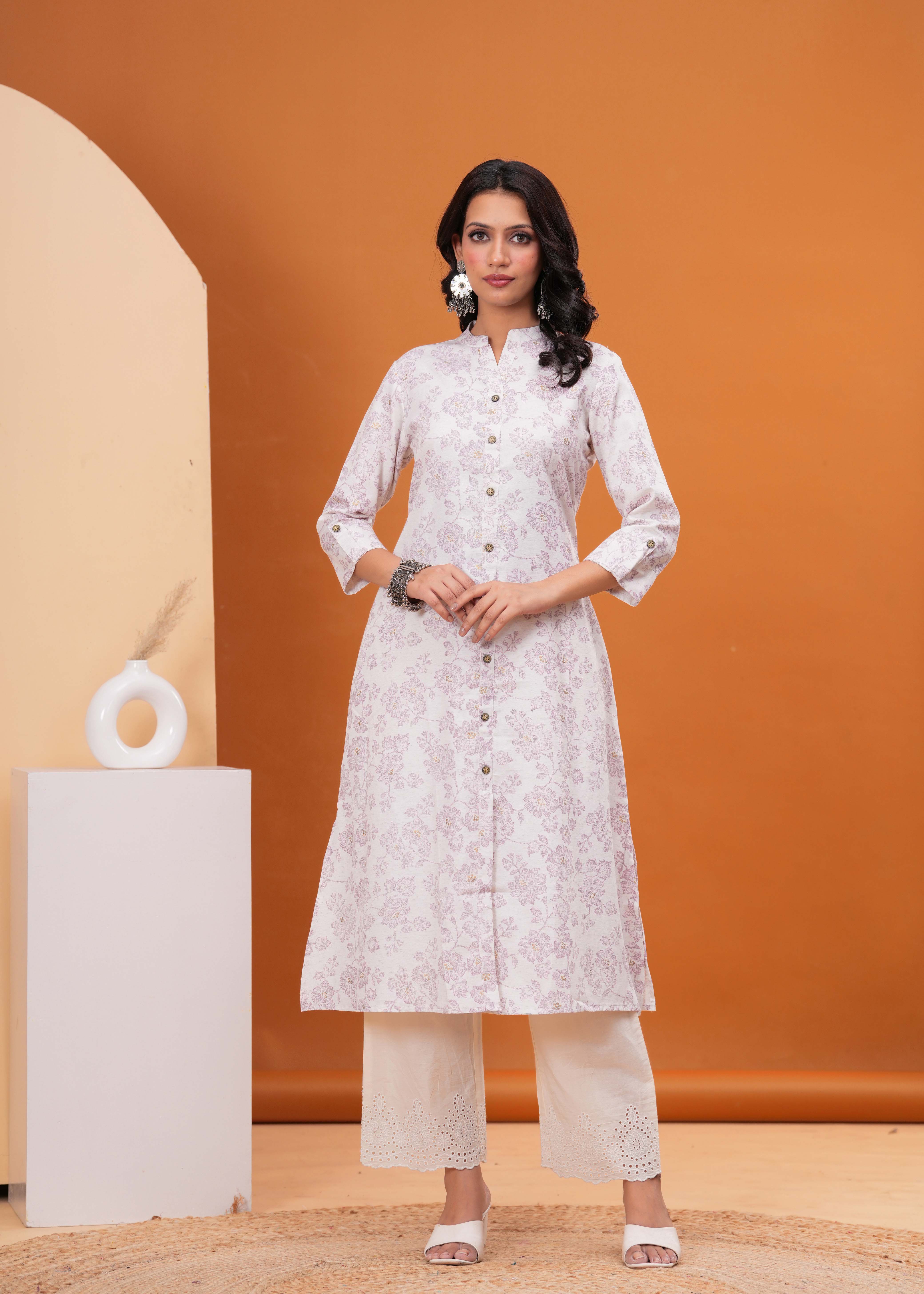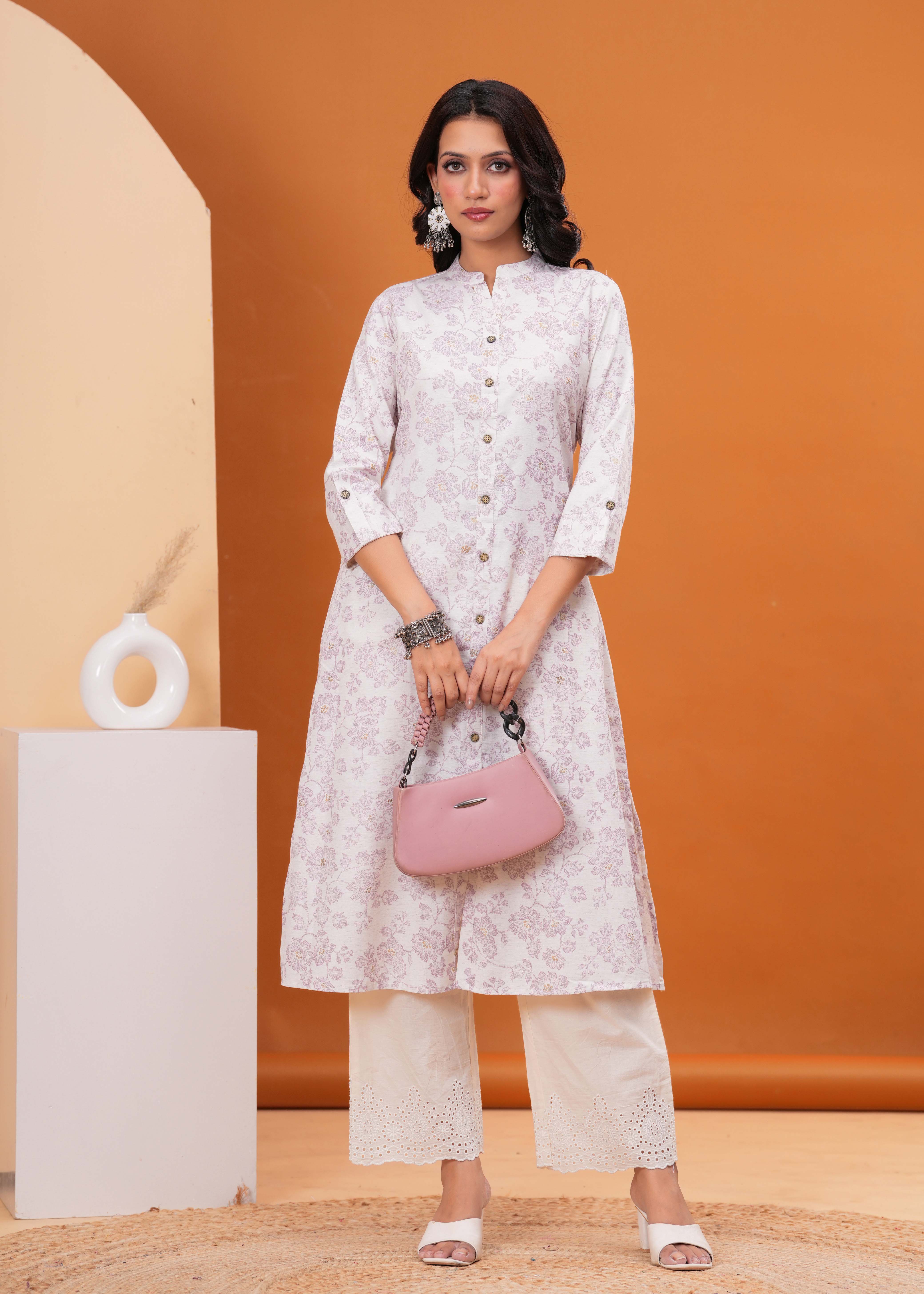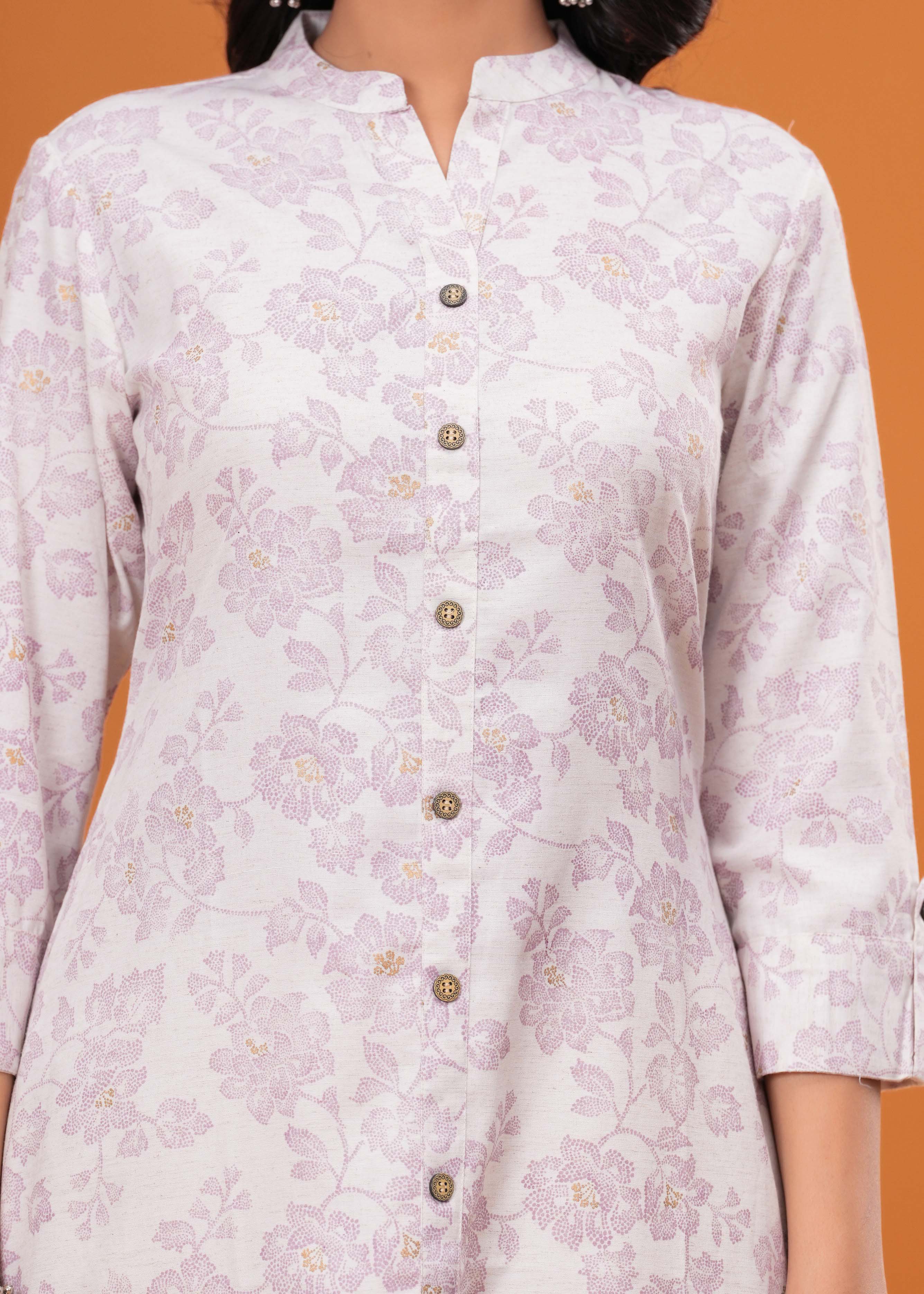 Elevate your everyday look with this elegant Off-White Ethnic Floral Printed Kurta, offering a blend of traditional style and comfort. Crafted from light and airy cotton flax fabric, this A-line flared kurta drapes beautifully and is perfect for warm weather. It features a chic mandarin collar and a full button placket, complementing the delicate, all-over ethnic floral print in subtle, soothing lilac and pale pink hues. The graceful flared silhouette adds a feminine touch, making this versatile kurta an ideal choice for pairing with straight pants or churidars for a refined daytime outfit.