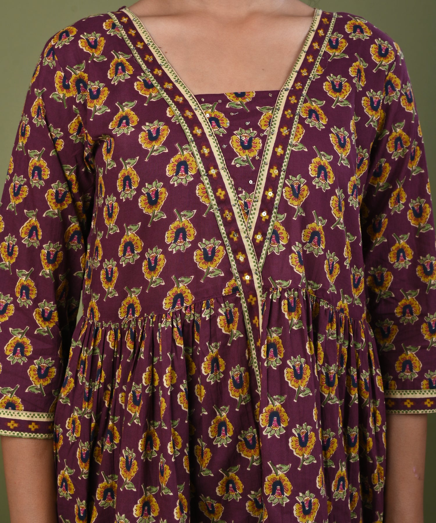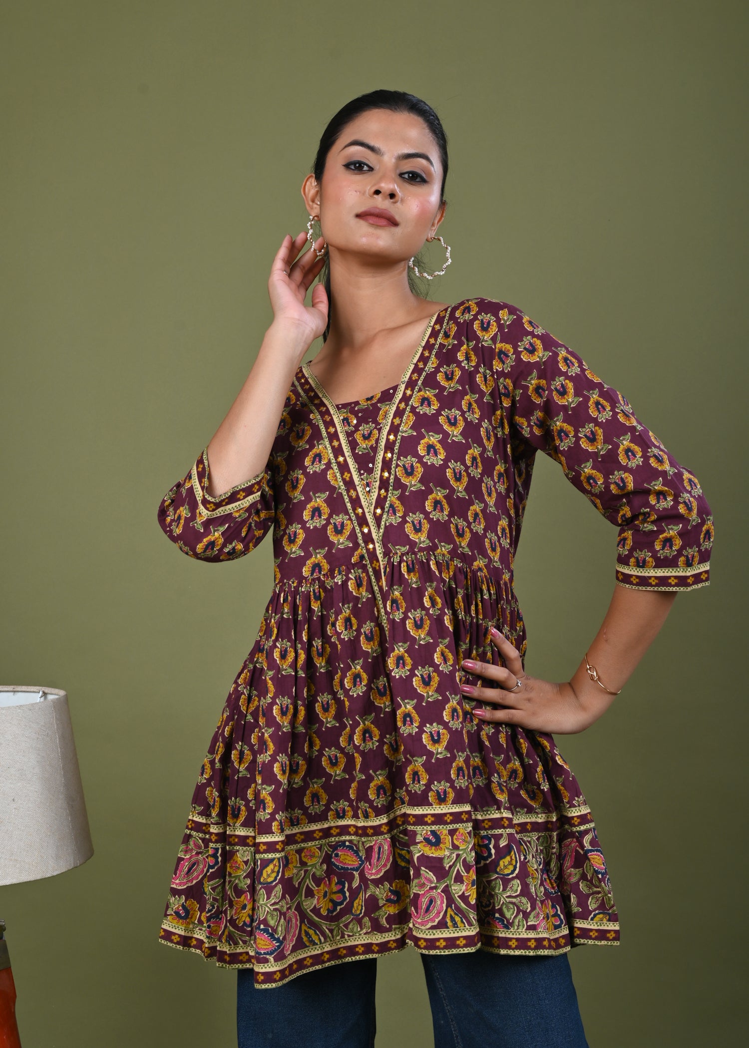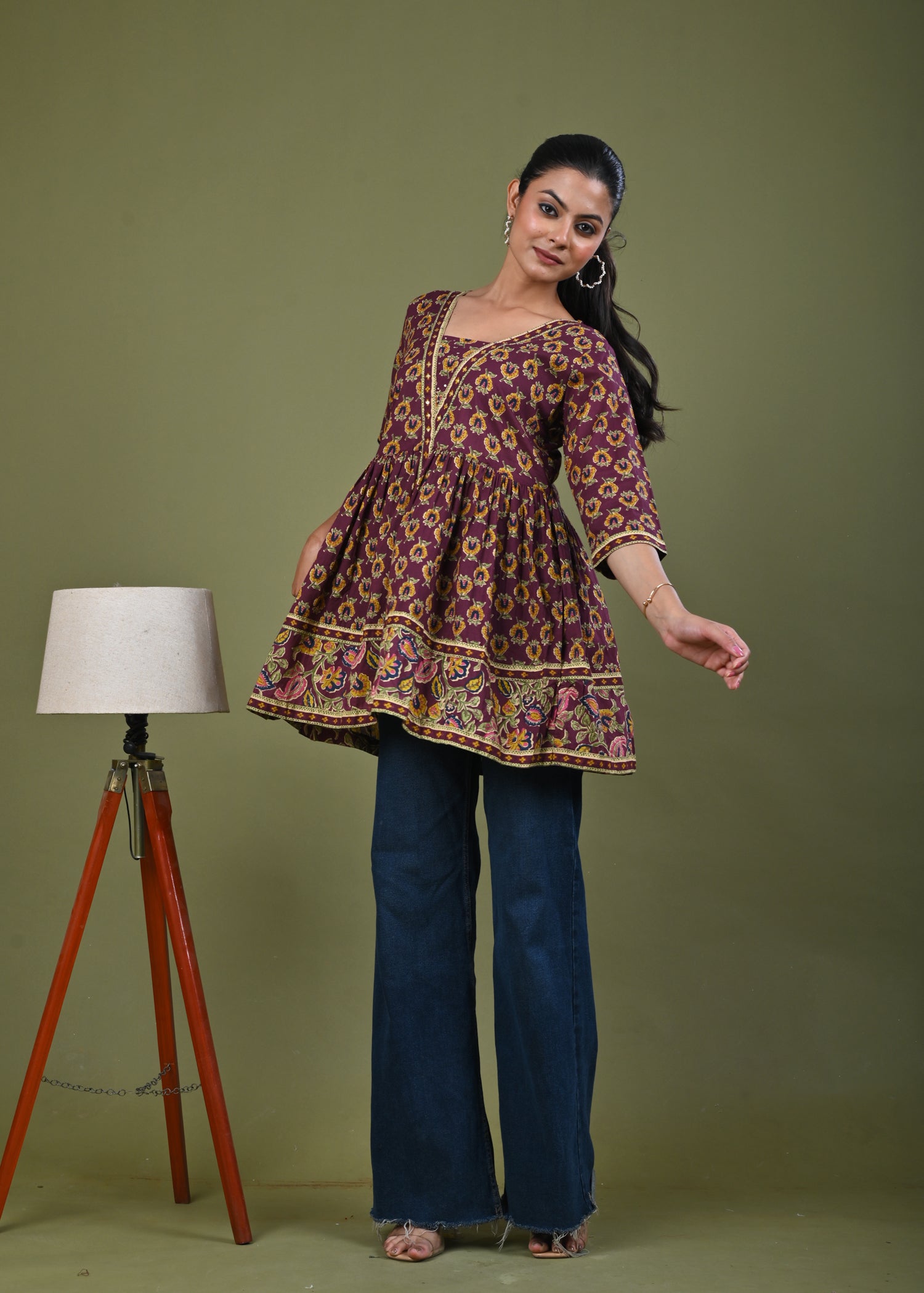 Ethnic Floral Printed A-Line Pleated Short Cotton Kurti - Burgundy