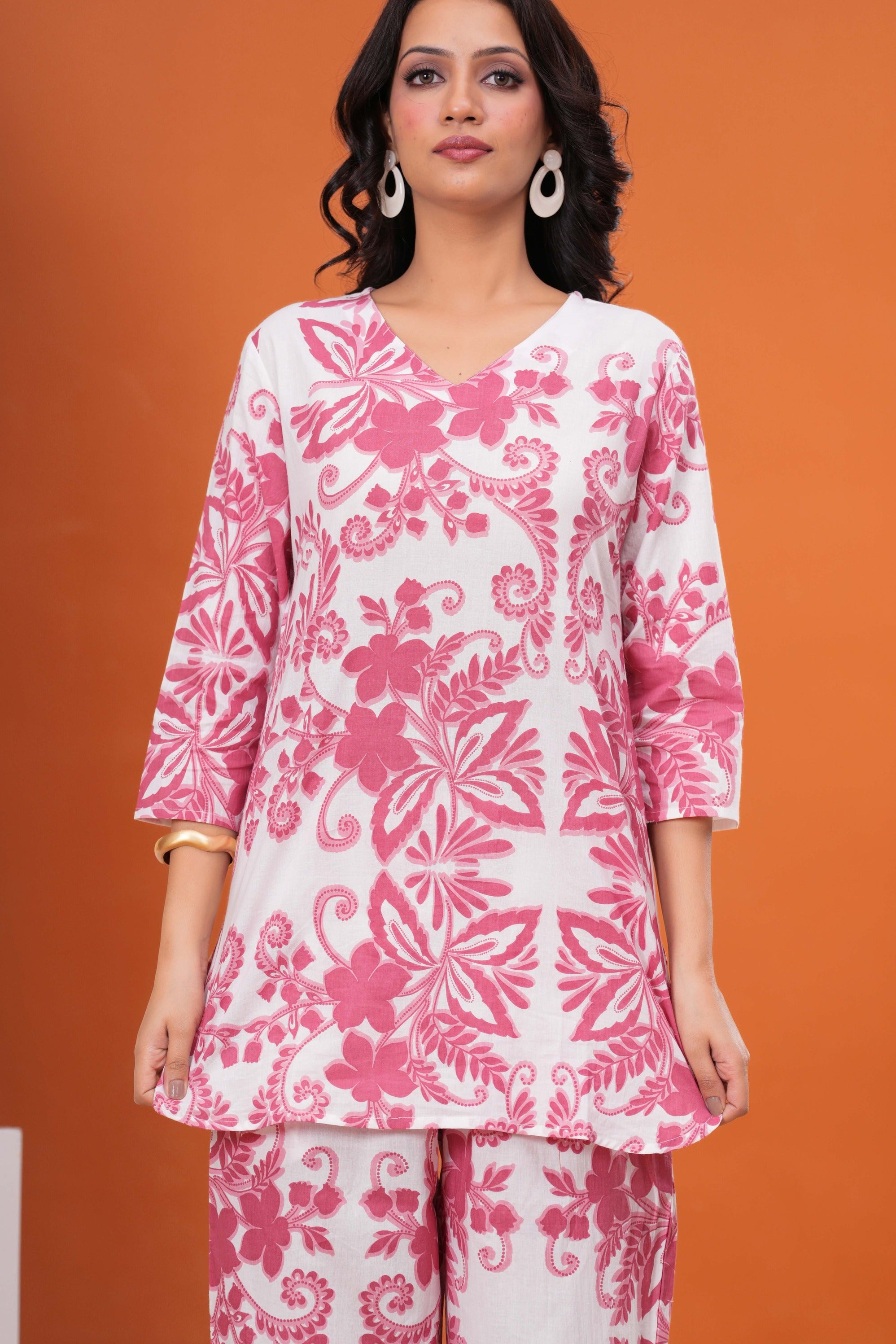 Embrace coordinated style with this striking Red Floral Printed Co-ord Set, designed for effortless, contemporary flair. Crafted from cool, comfortable pure cotton fabric, this two-piece ensemble is perfect for relaxed outings. The top features a flattering V-neckline and a chic, all-over ethnic floral print in vibrant red and white. It is perfectly paired with matching straight-fit pants that carry the same eye-catching print, offering a cohesive and stylish look. This set provides the ease of ready-to-wear fashion and is a must-have for adding a bold, graphic touch to your casual wardrobe.