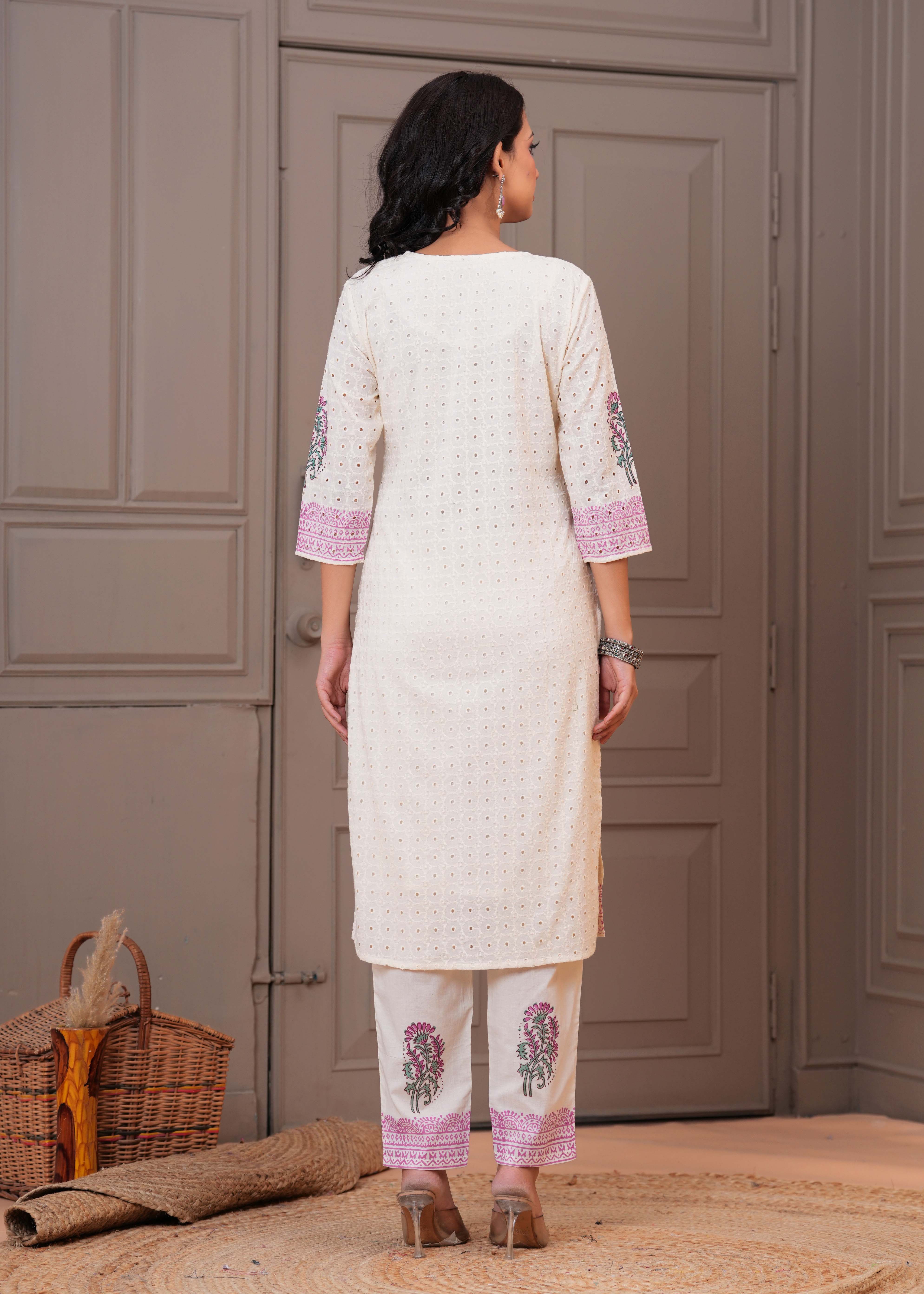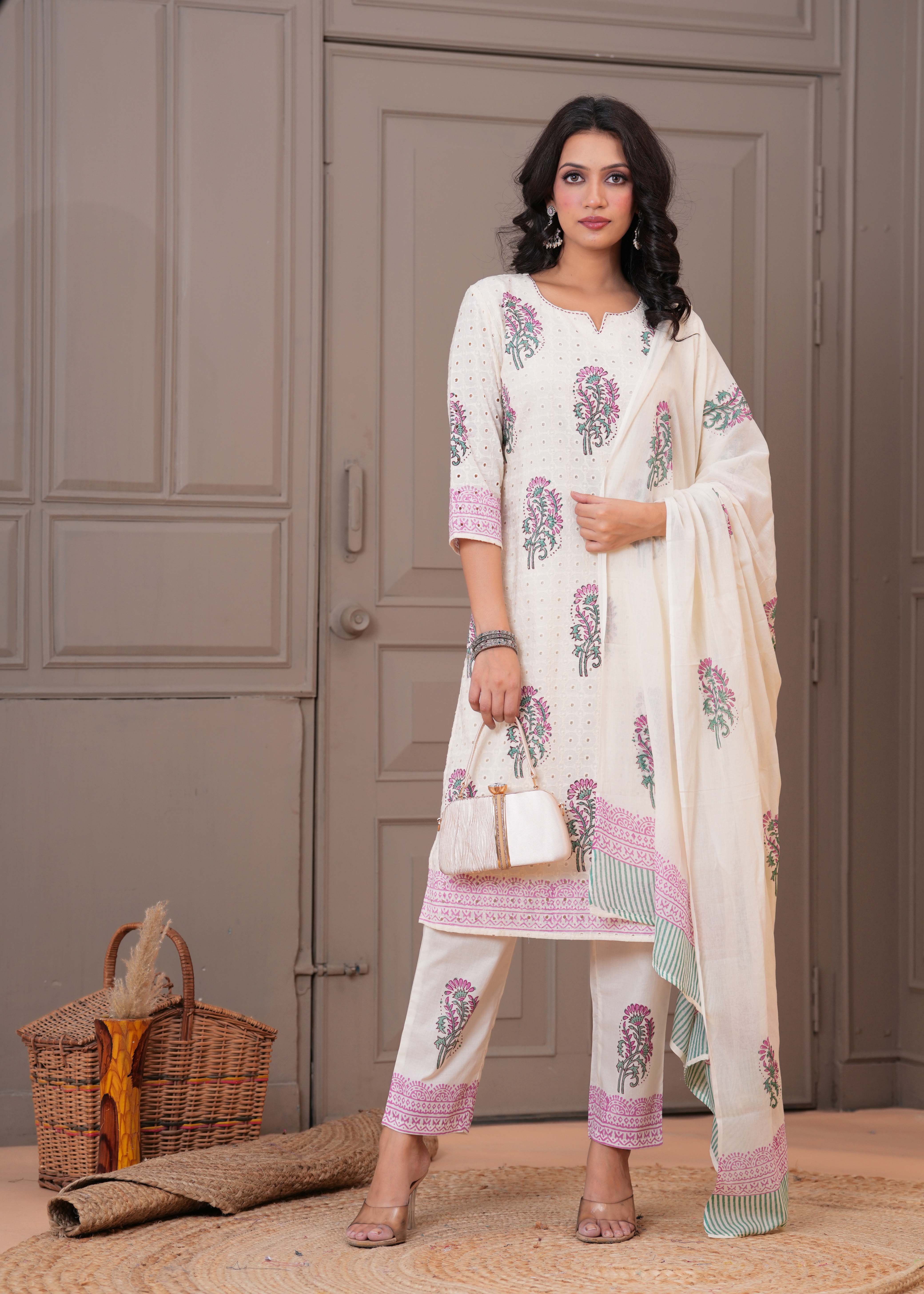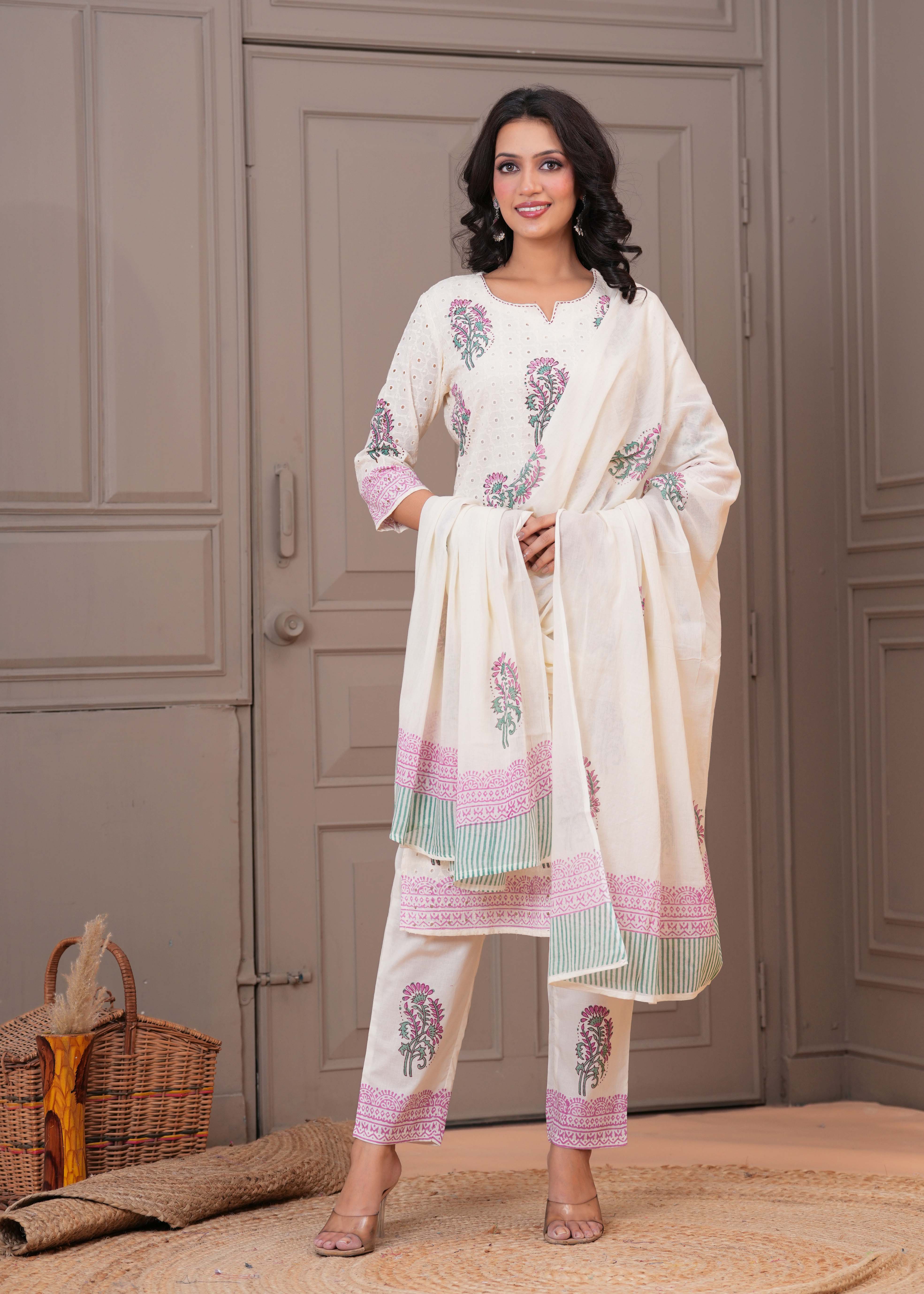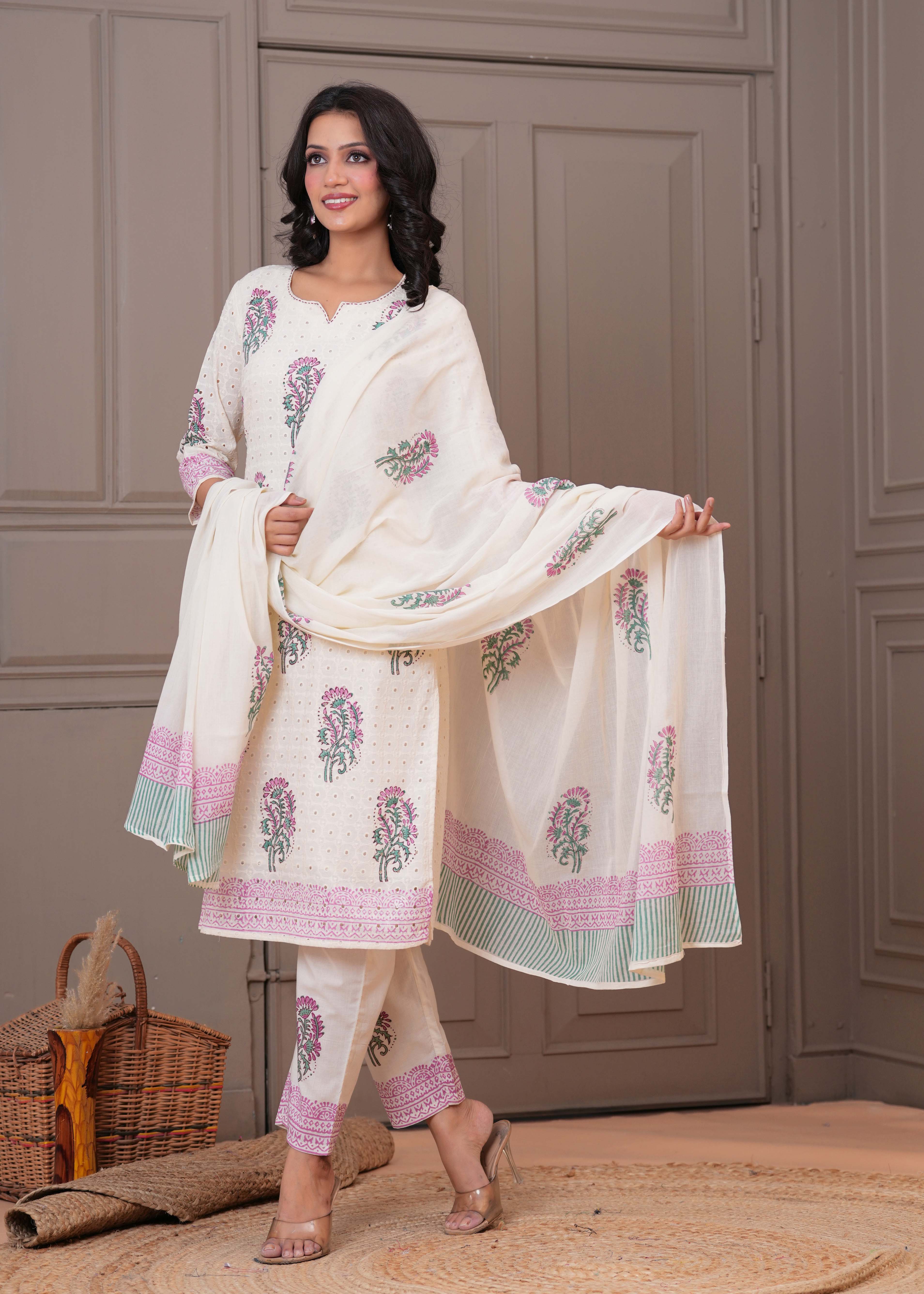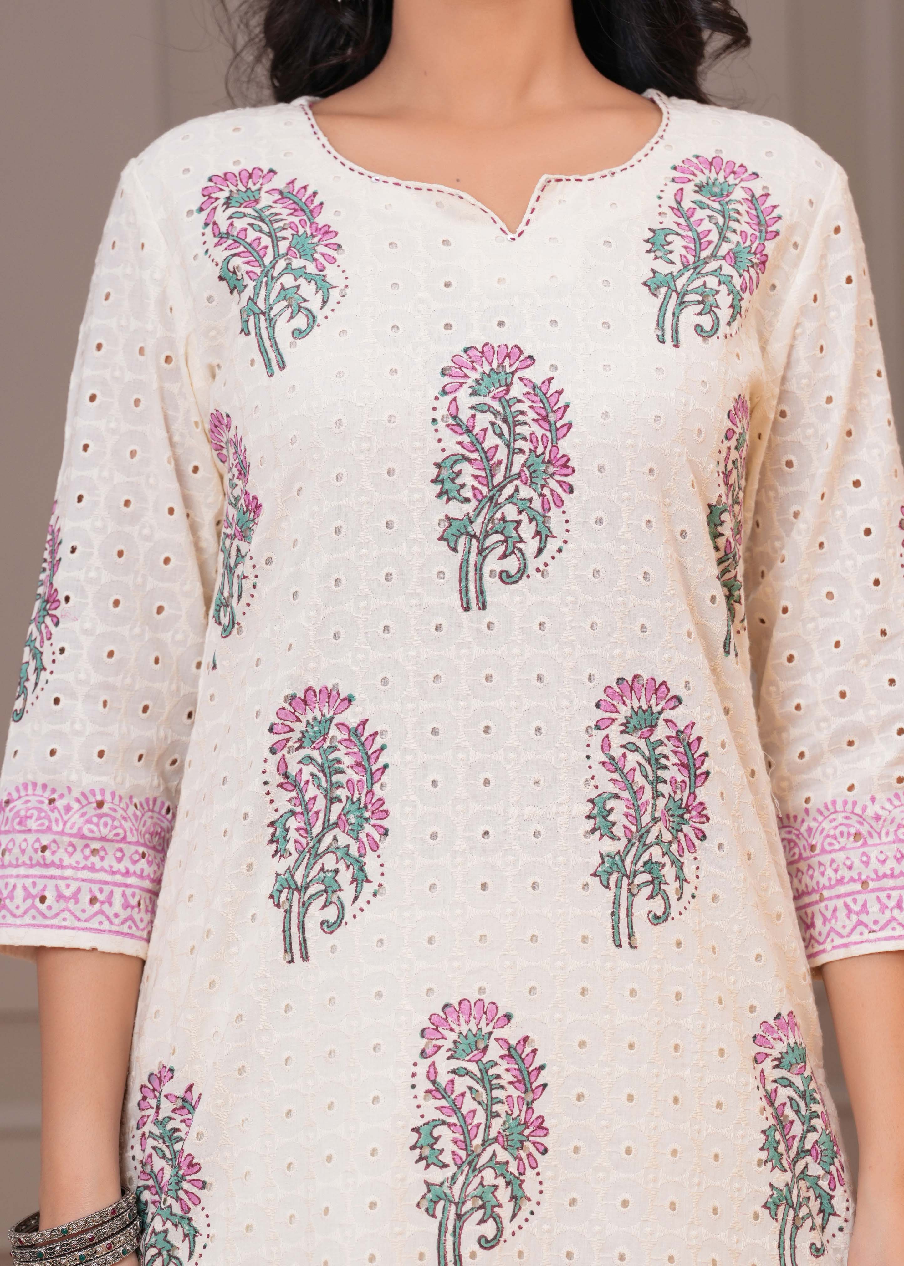 Elevate your ethnic wardrobe with this gorgeous Cream Floral Block Printed Kurta Set, a perfect blend of comfort and style. The straight-fit kurta is crafted from a luxurious mix of breathable cotton and textured Schiffli fabric, featuring exquisite hand block prints in pink and green floral motifs. It has a classic round neck and practical sleeves, complemented by matching tailored cotton pants with a printed border. Completing the look is a soft, flowy pure cotton dupatta with coordinating block print detailing. This three-piece set offers effortless elegance, making it an ideal choice for any daytime event.
