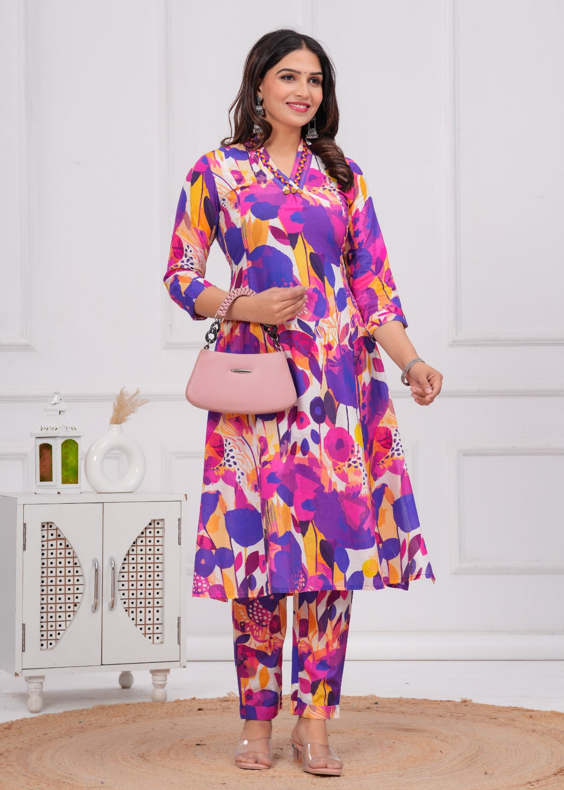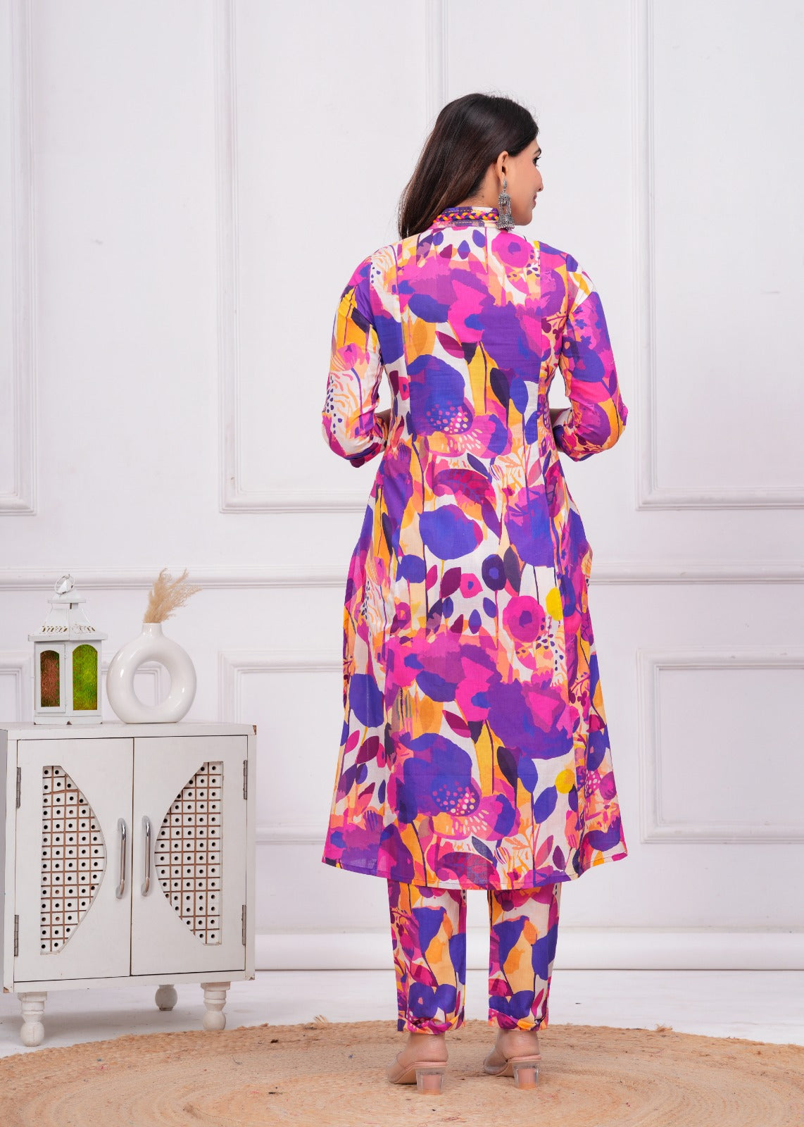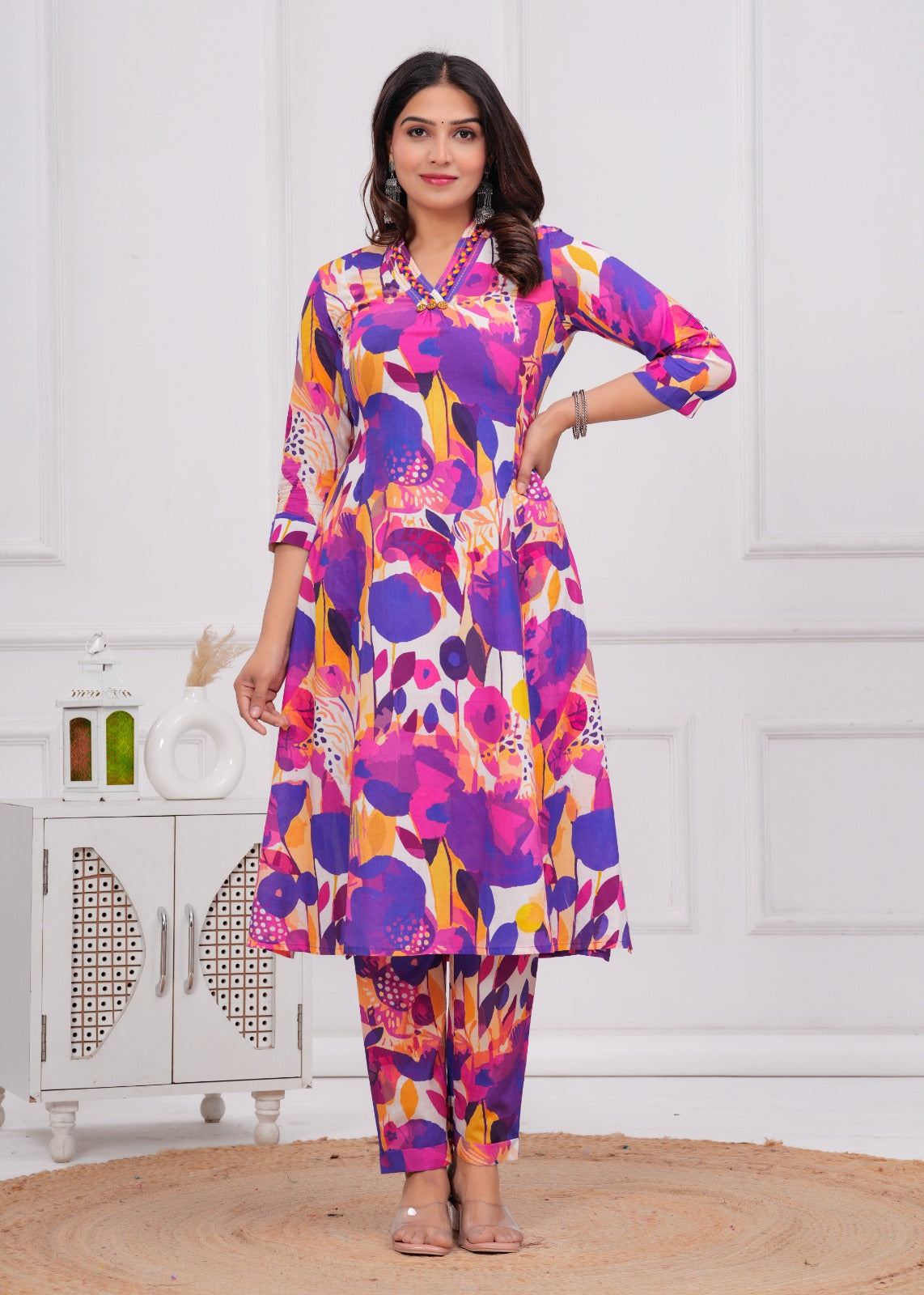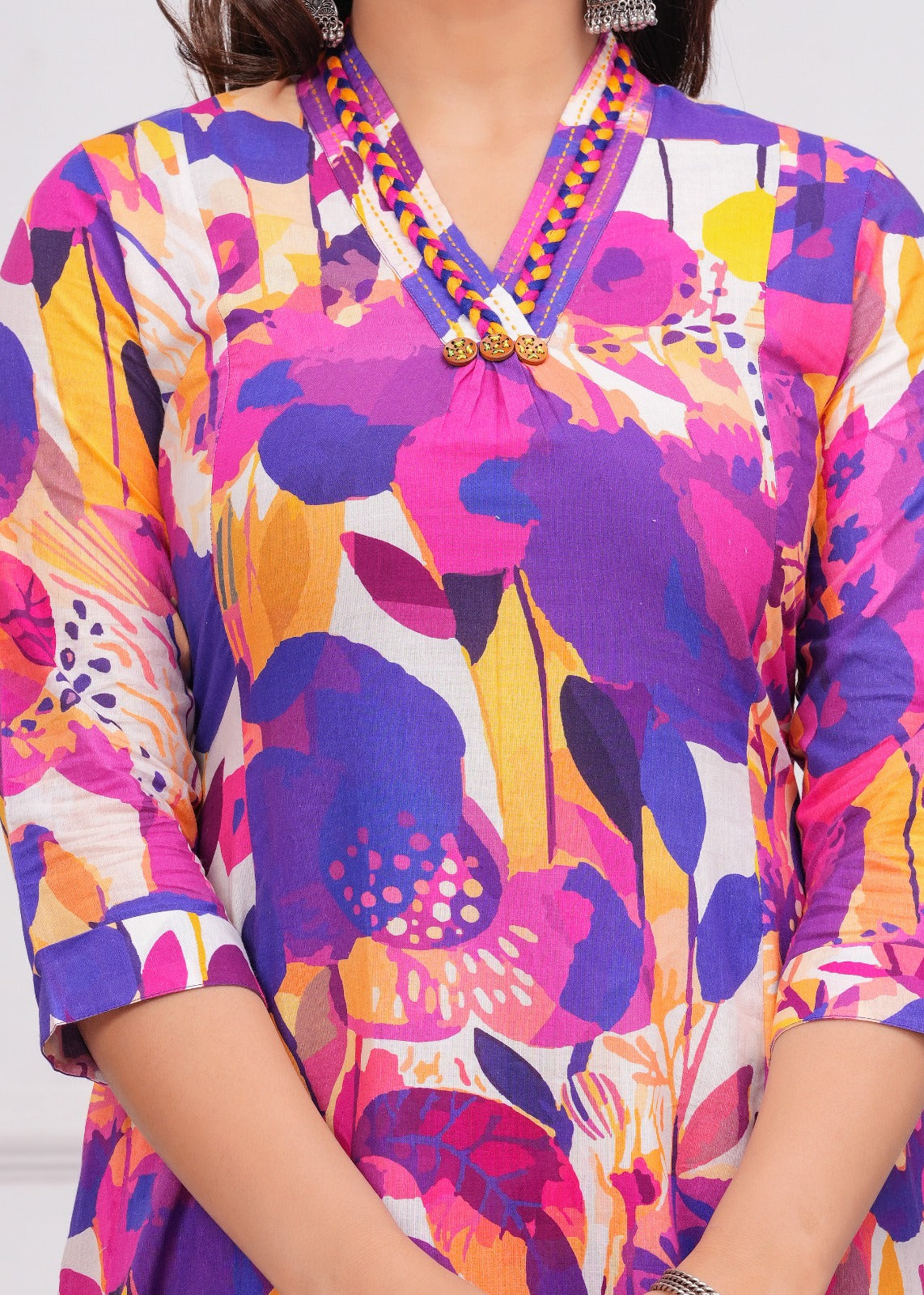 Make a truly bold and unforgettable statement with this captivating Multi-Printed Kurta Set, designed for vibrant self-expression and modern comfort. This two-piece ensemble is a celebration of color, featuring a gracefully flared A-line-style Kurta showcasing an eye-catching, abstract Floral Print in a vivid palette of fuchsia, electric purple, sunny orange, and bright pink. The kurta includes a flattering split V-neckline for a refined look with multi color braided lace detailing. The kurta is perfectly complemented by matching Printed Bottoms that carry the same dynamic, all-over abstract print, ensuring a fully cohesive and striking look. This ready-to-wear set is a must-have for injecting a dose of playful, electric color into your festive or casual wardrobe.