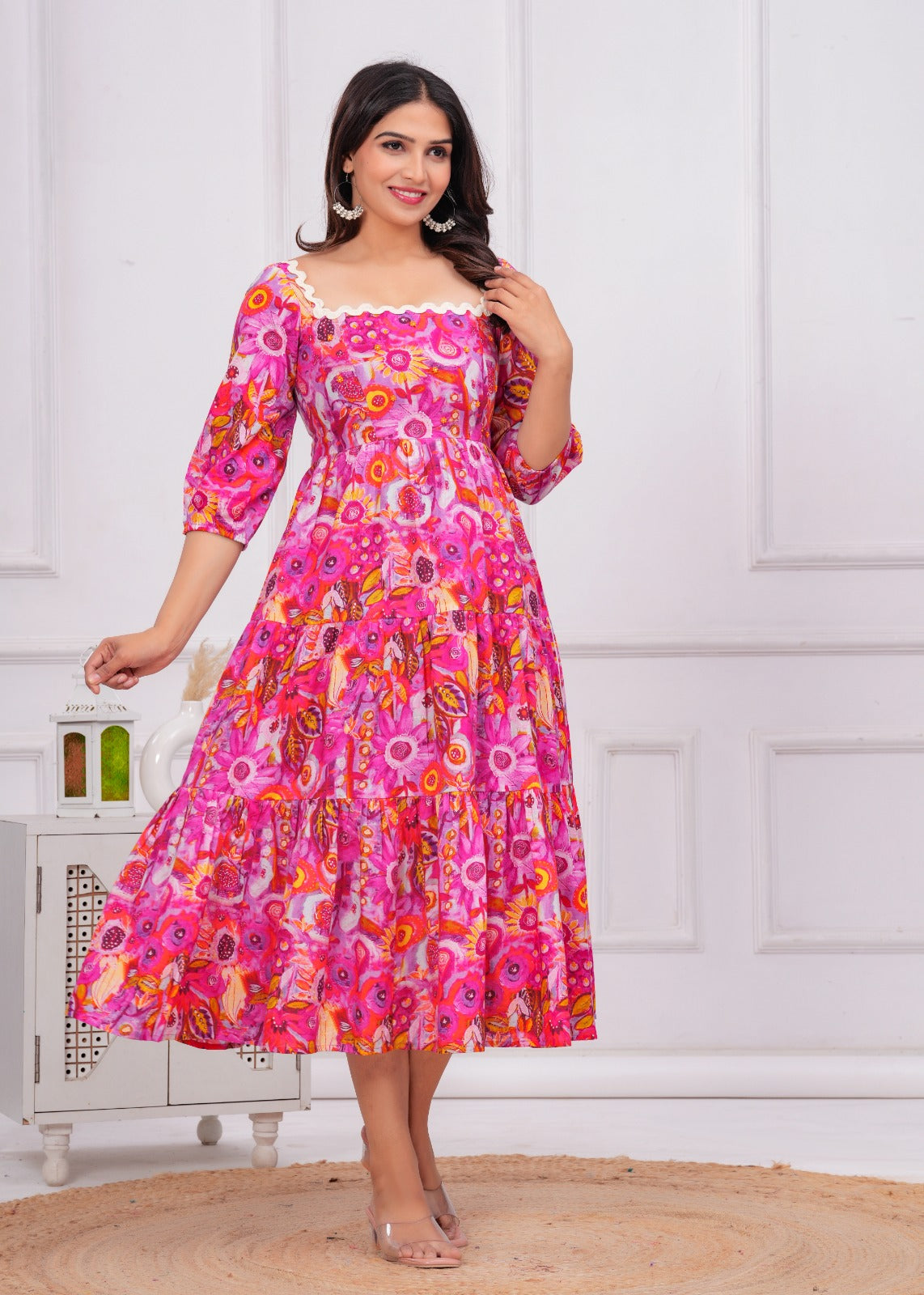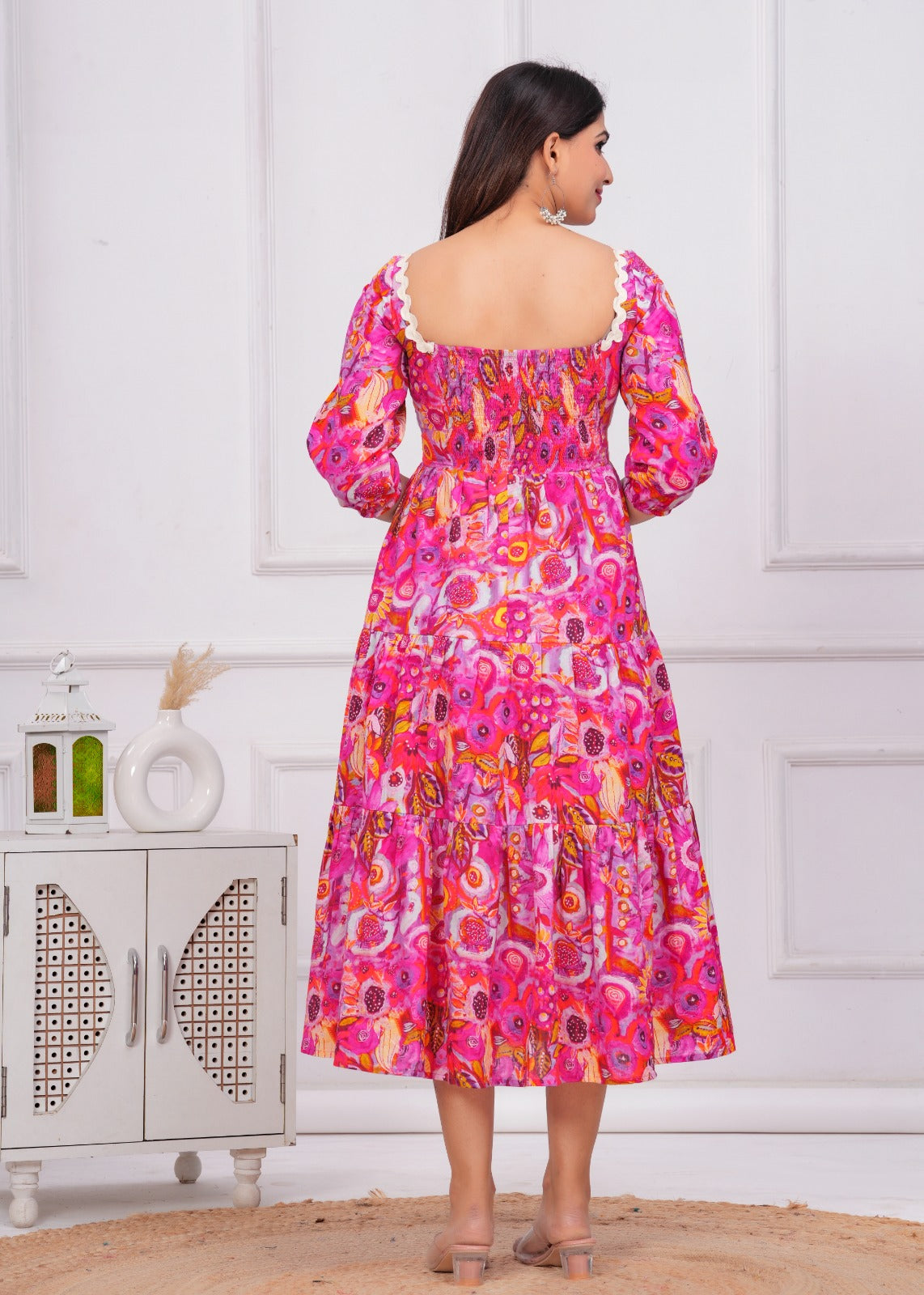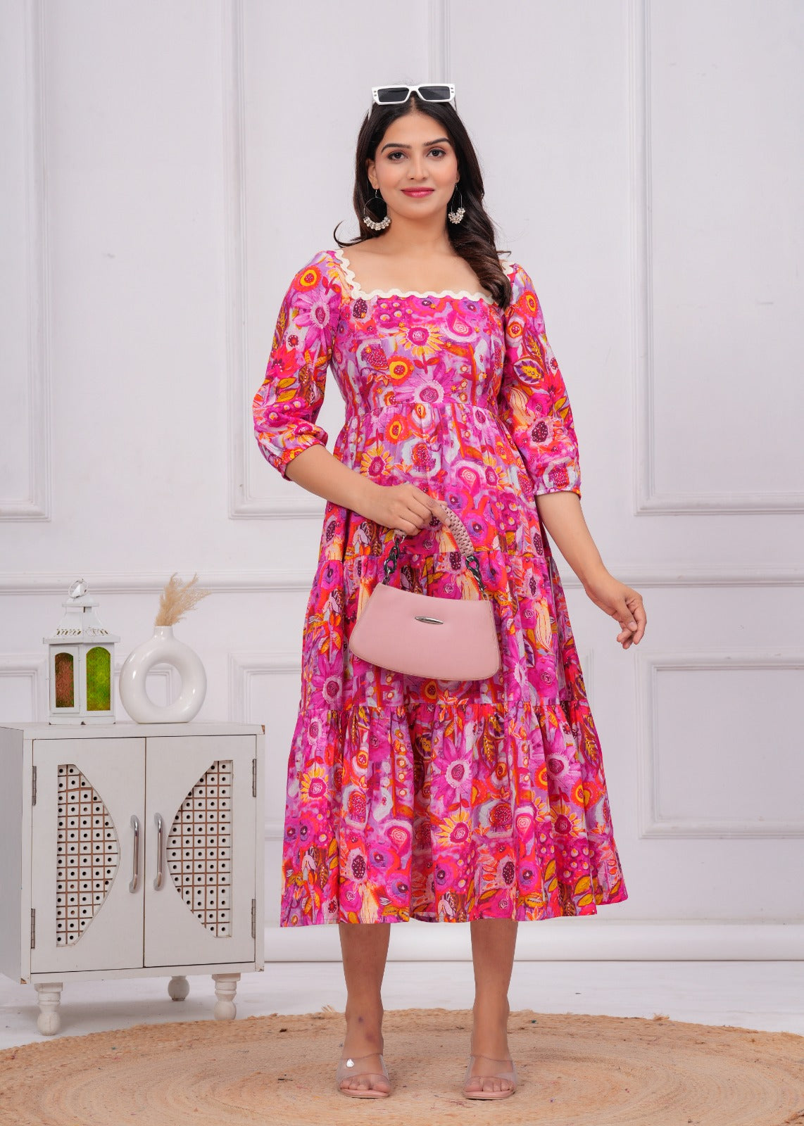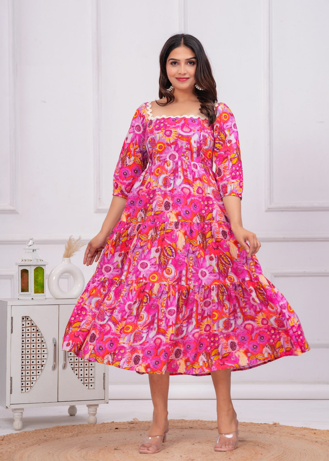 Embrace playful elegance with this striking Tiered Flared Maxi Dress, designed for a captivating and feminine silhouette. This lively dress is crafted from a comfortable cotton fabric, perfect for sunny outings and festive brunches. The dress features a flattering Square-Neckline beautifully detailed with delicate zig-zag crochet lace, adding a touch of vintage charm. It boasts chic puff sleeves and cascades into a full, tiered skirt that enhances its voluminous flare and ensures beautiful movement. Adorned with a vibrant, all-over floral print in rich fuchsia, pink, yellow, and orange tones, this maxi dress is a ready-to-wear statement piece that instantly brightens your casual wardrobe.