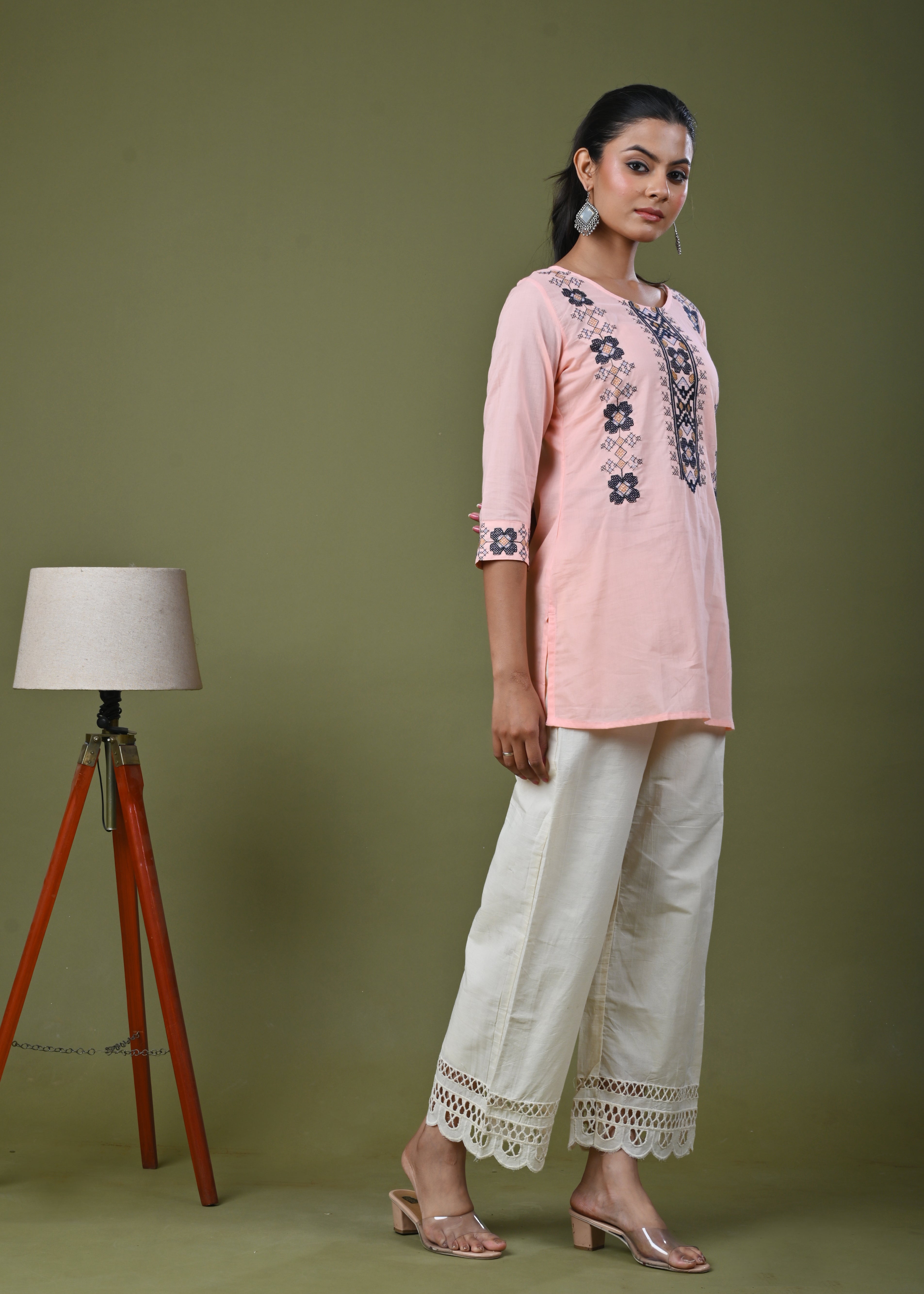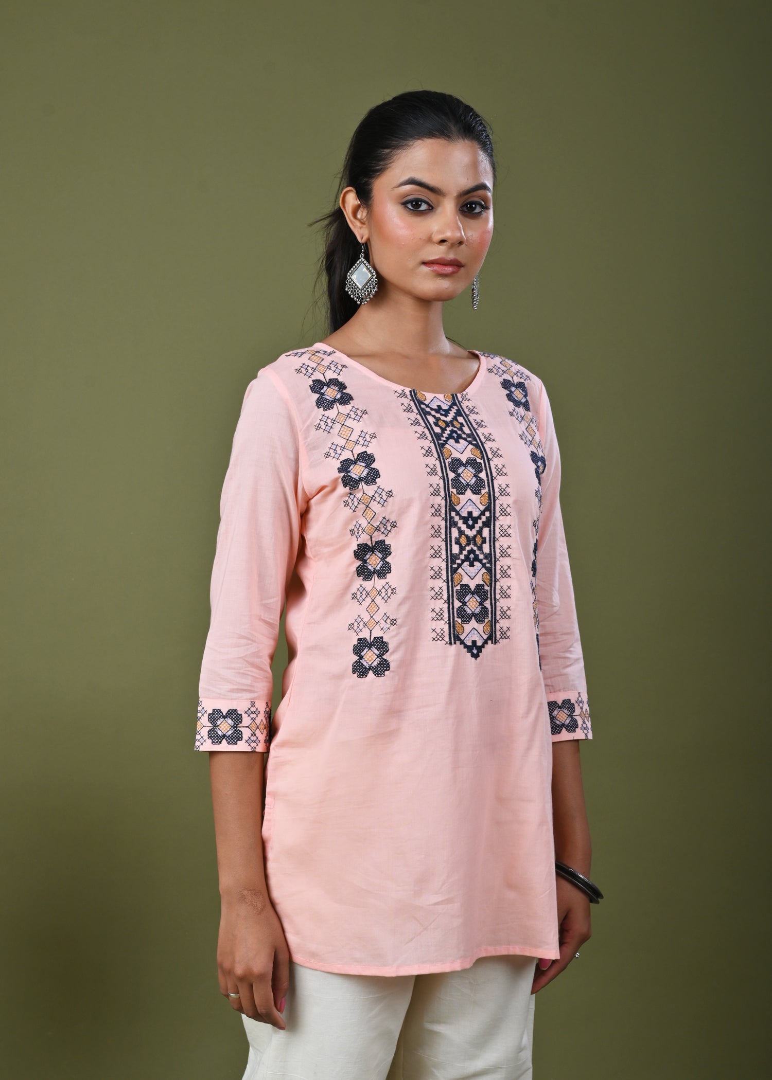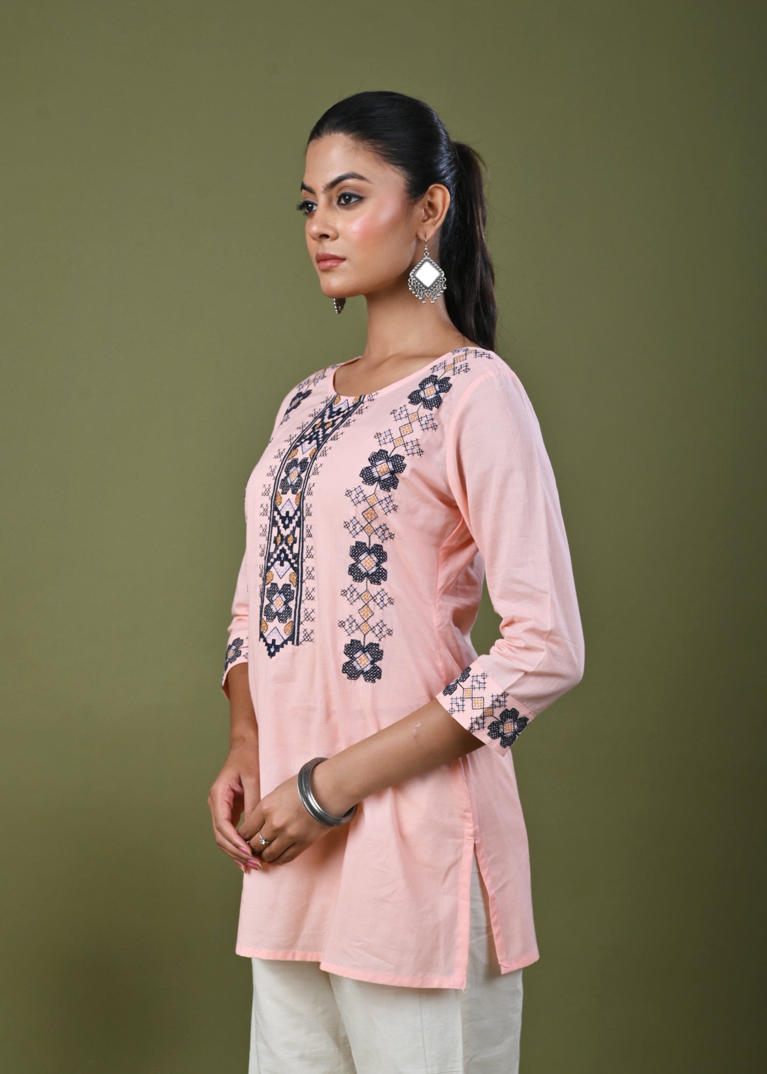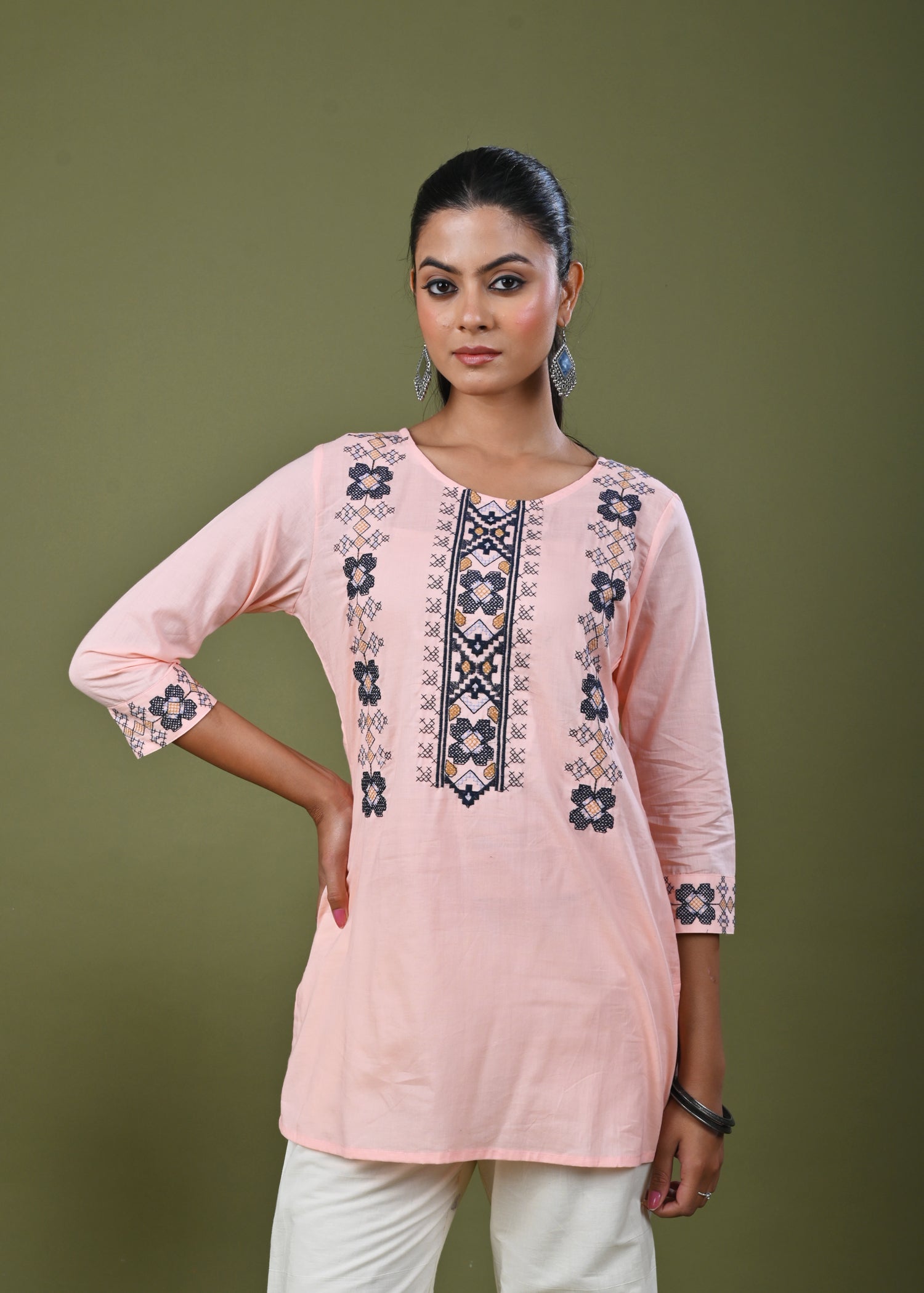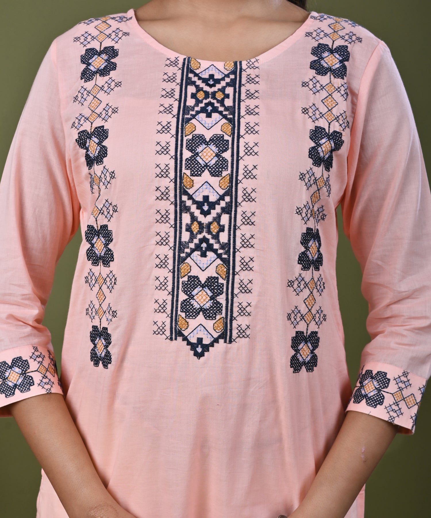 Solid Cross Stitch Embroidered Straight Fit Cotton Kurti - Peach