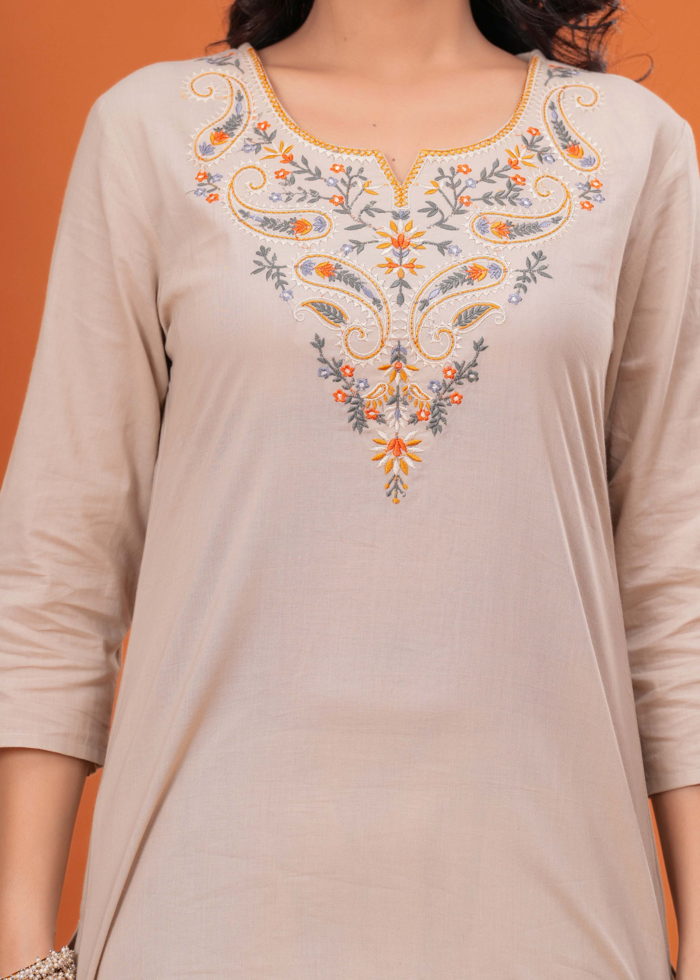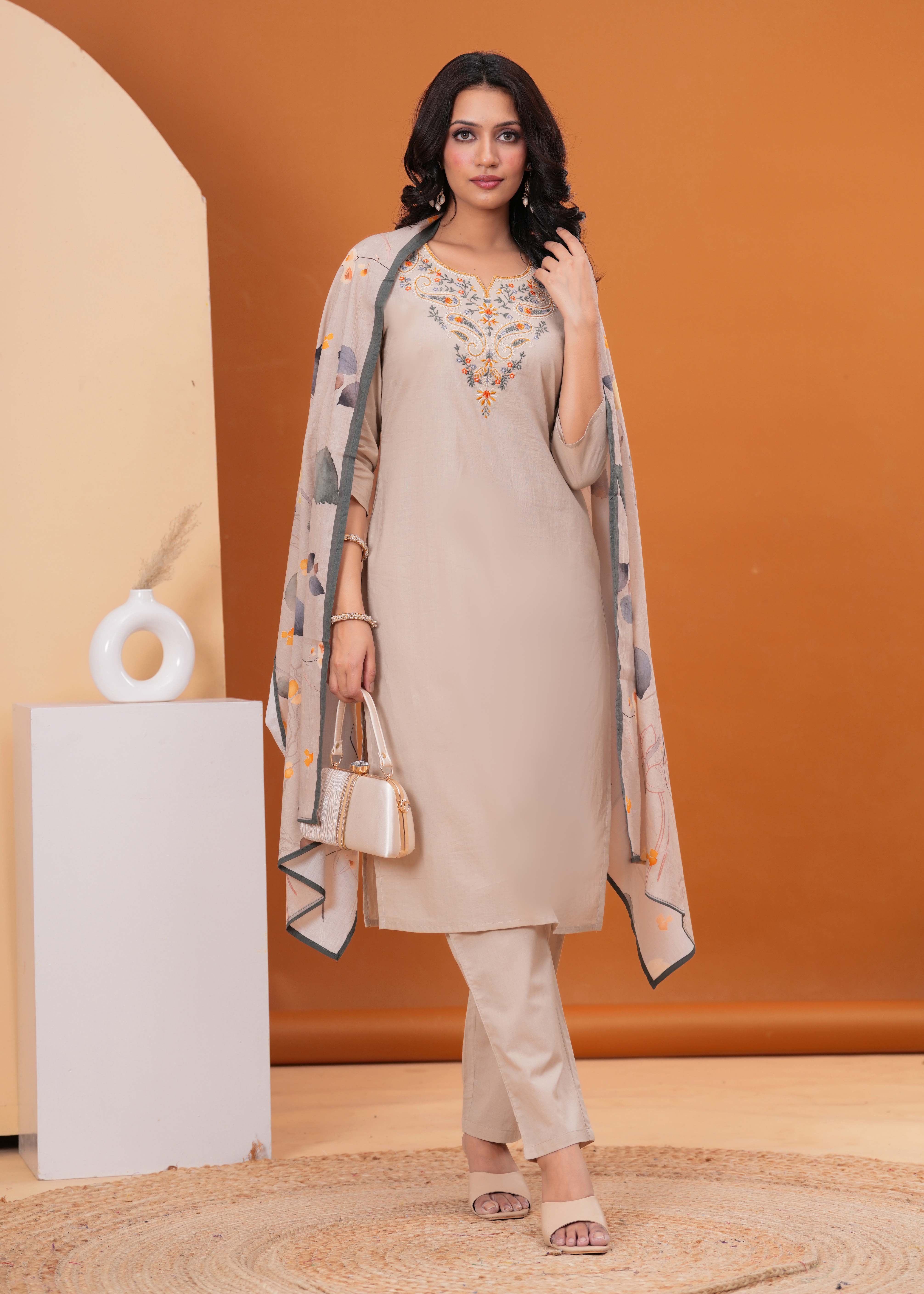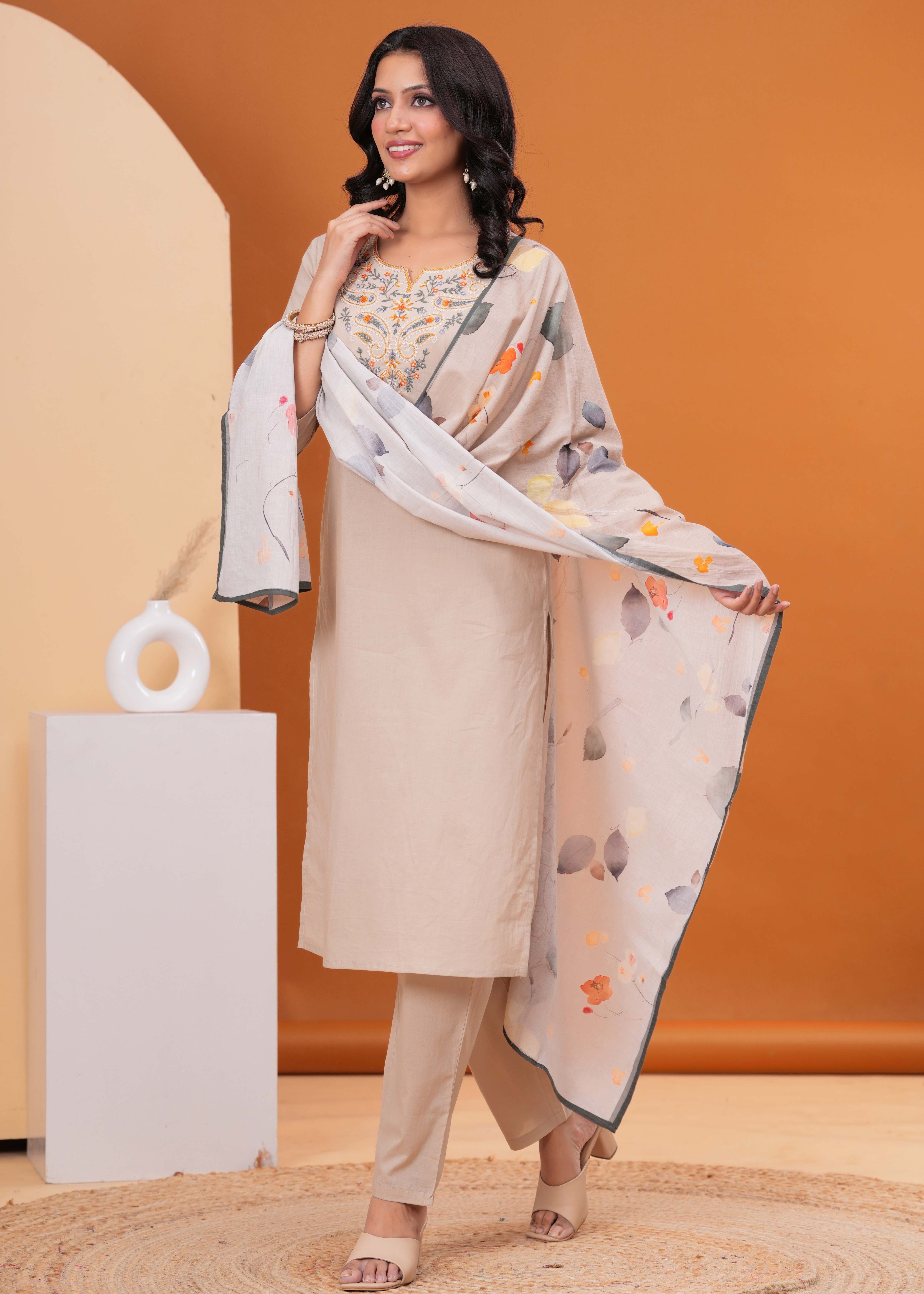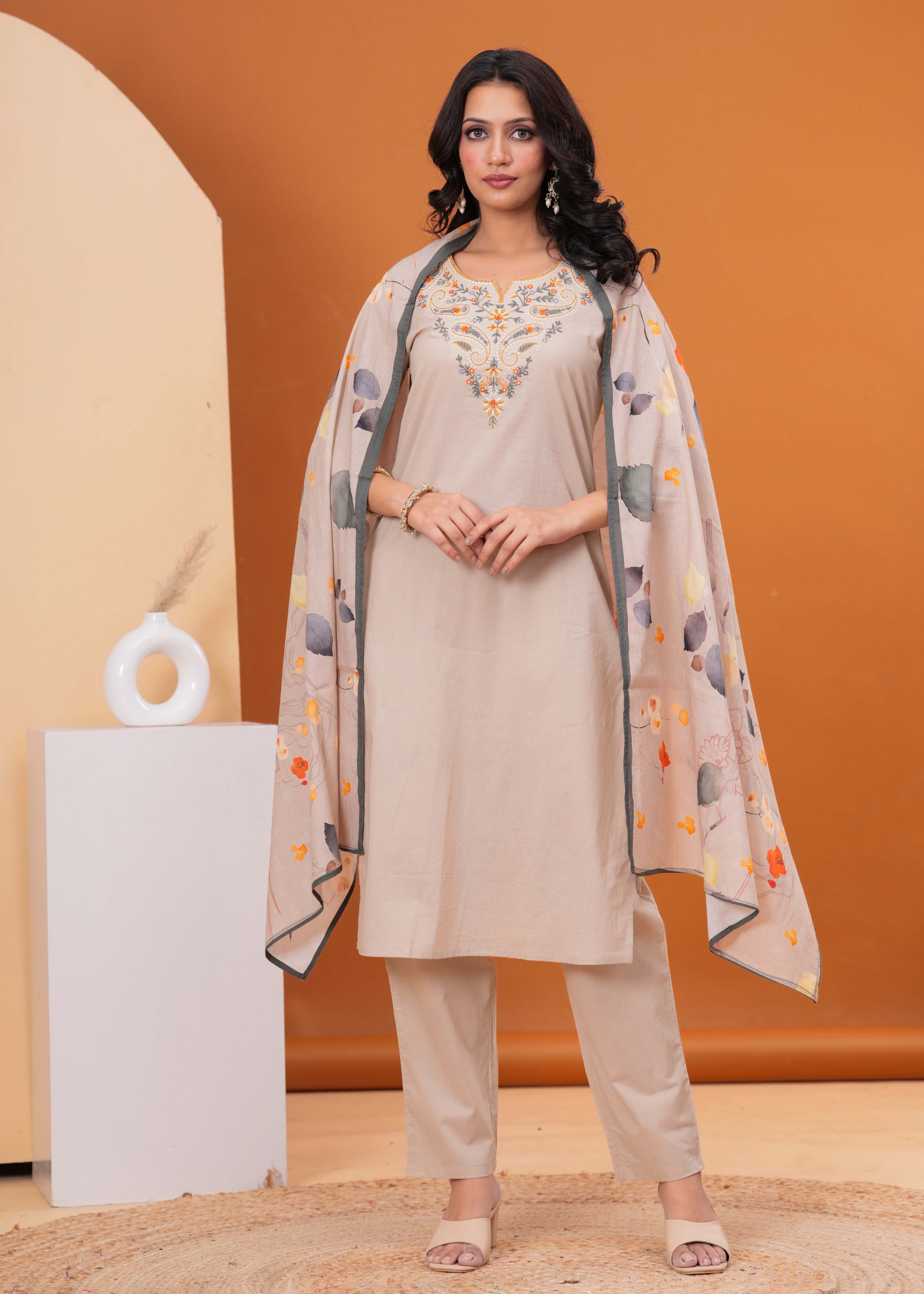 Step into sophisticated everyday style with this elegant Taupe Solid Kurta Set, a beautiful piece crafted from soft, breathable pure cotton fabric. The straight-fit kurta features a graceful round neck and is beautifully enhanced by an intricately floral resham embroidered yoke, complemented by delicate crochet lace detailing. This versatile piece is paired with comfortable solid taupe pants and completed by a stunning printed dupatta featuring an artistic botanical design in muted tones of orange, grey, and green. This ensemble is a perfect blend of understated elegance and vibrant detailing, ideal for both office wear and refined casual outings.