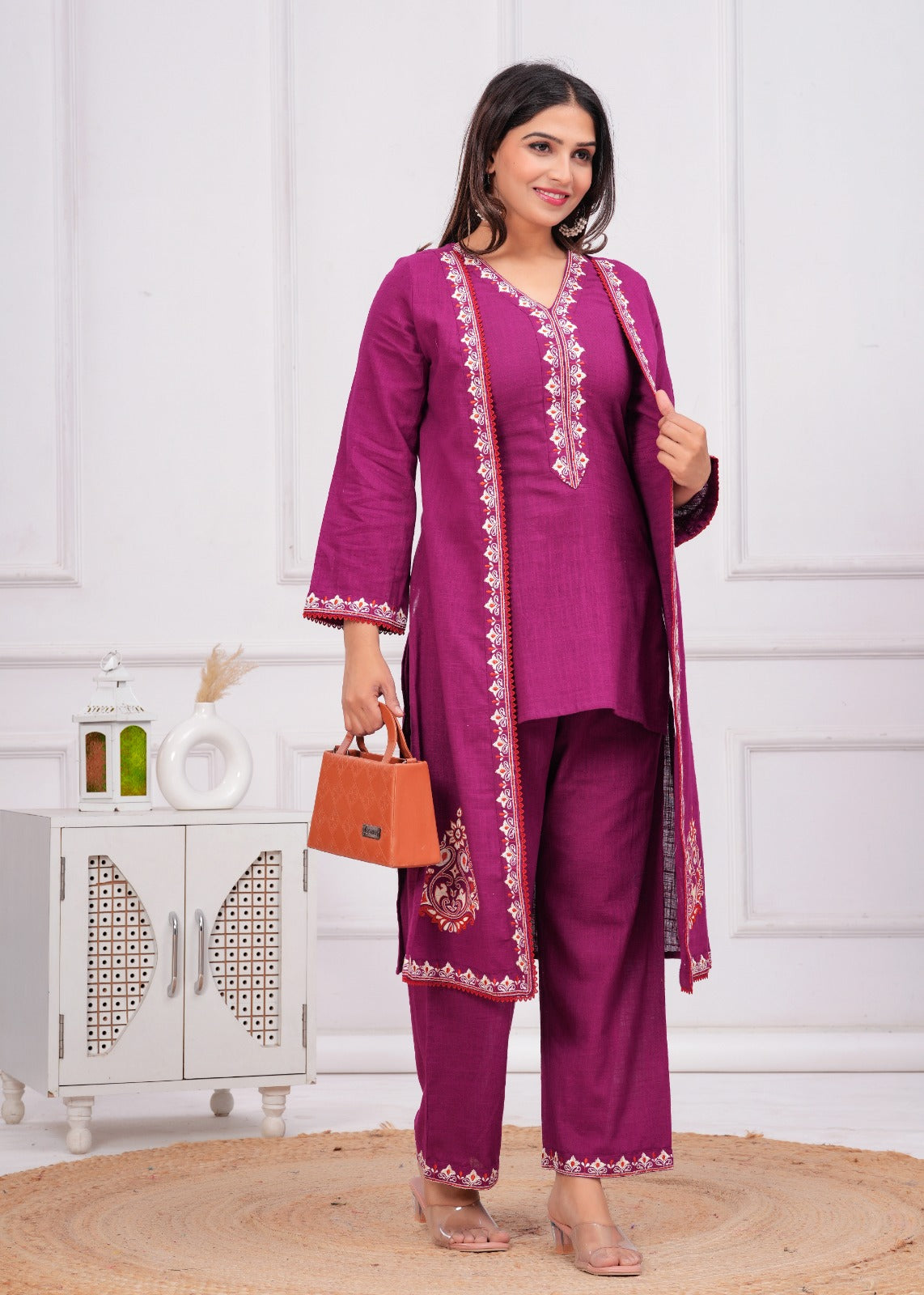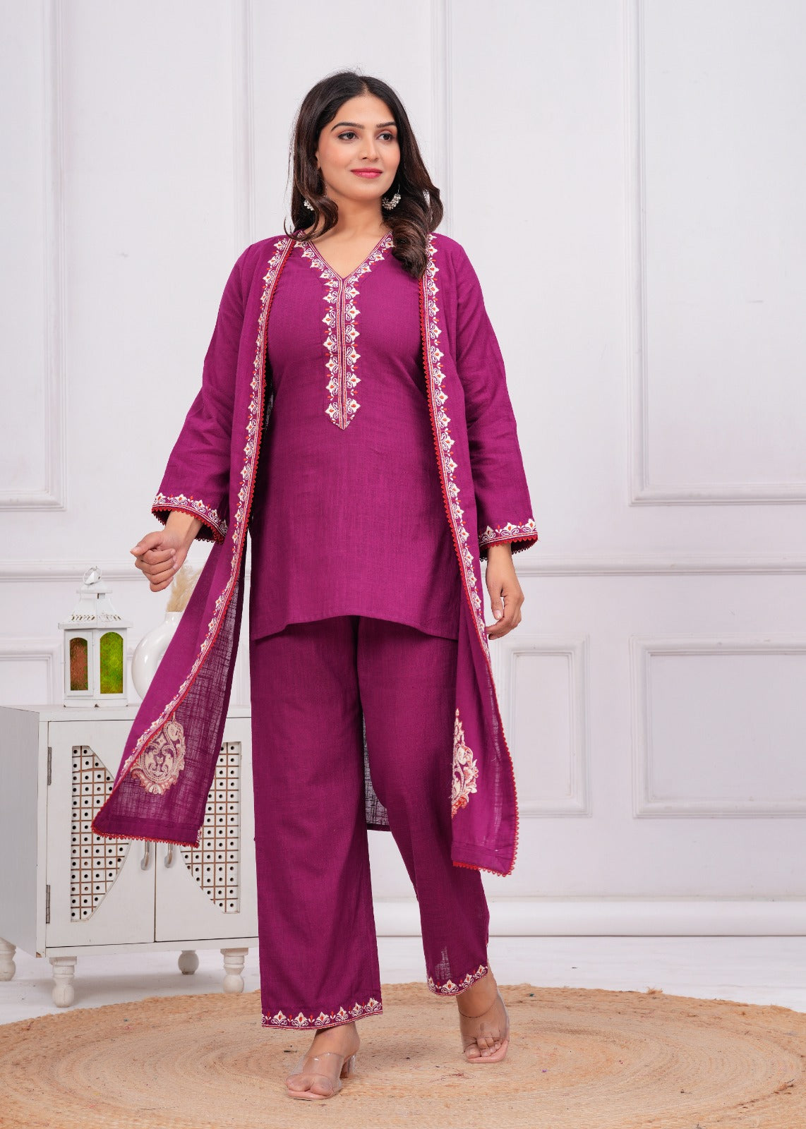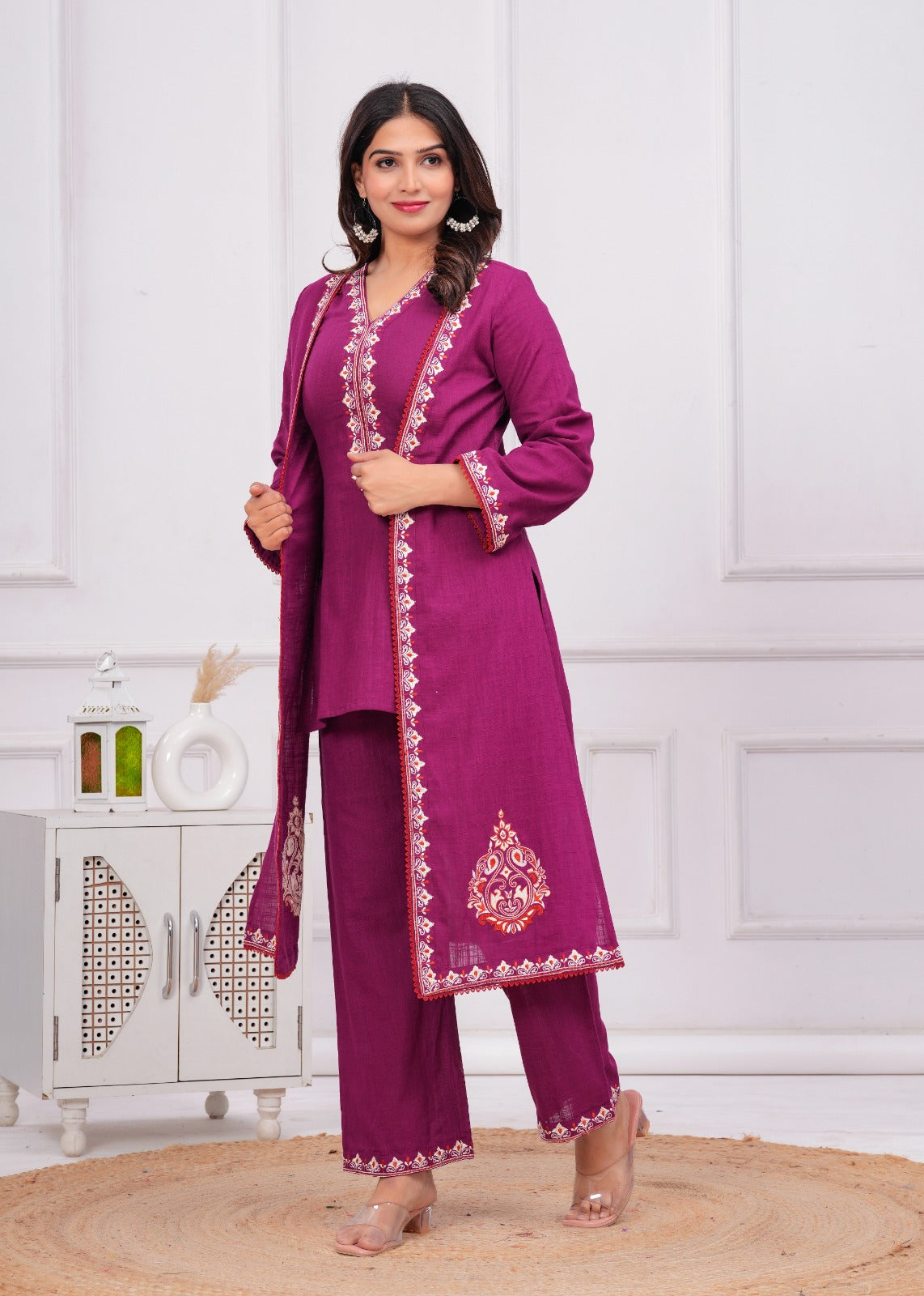Elevate your look with this captivating Three-Piece Wine Ensemble, designed for a sophisticated, layered style. Crafted from a rich, textured cotton slub fabric, this set is perfect for making a memorable statement at festive gatherings and special occasions. The inner layer features a tailored Straight Short Kurti with a flattering V-Neckline. This is beautifully complemented by solid, comfortable Palazzo Pants that provide a balanced silhouette. The defining piece is the graceful, A-Line Embroidered Long Open Jacket, which cascades elegantly and adds dramatic flair. The jacket, kurti, and palazzo are all adorned with exquisite Ethnic Resham Embroidery featuring intricate thread work motifs along the borders and jacket hems in contrasting shades of red and white, ensuring a highly coordinated and luxuriously detailed finish.