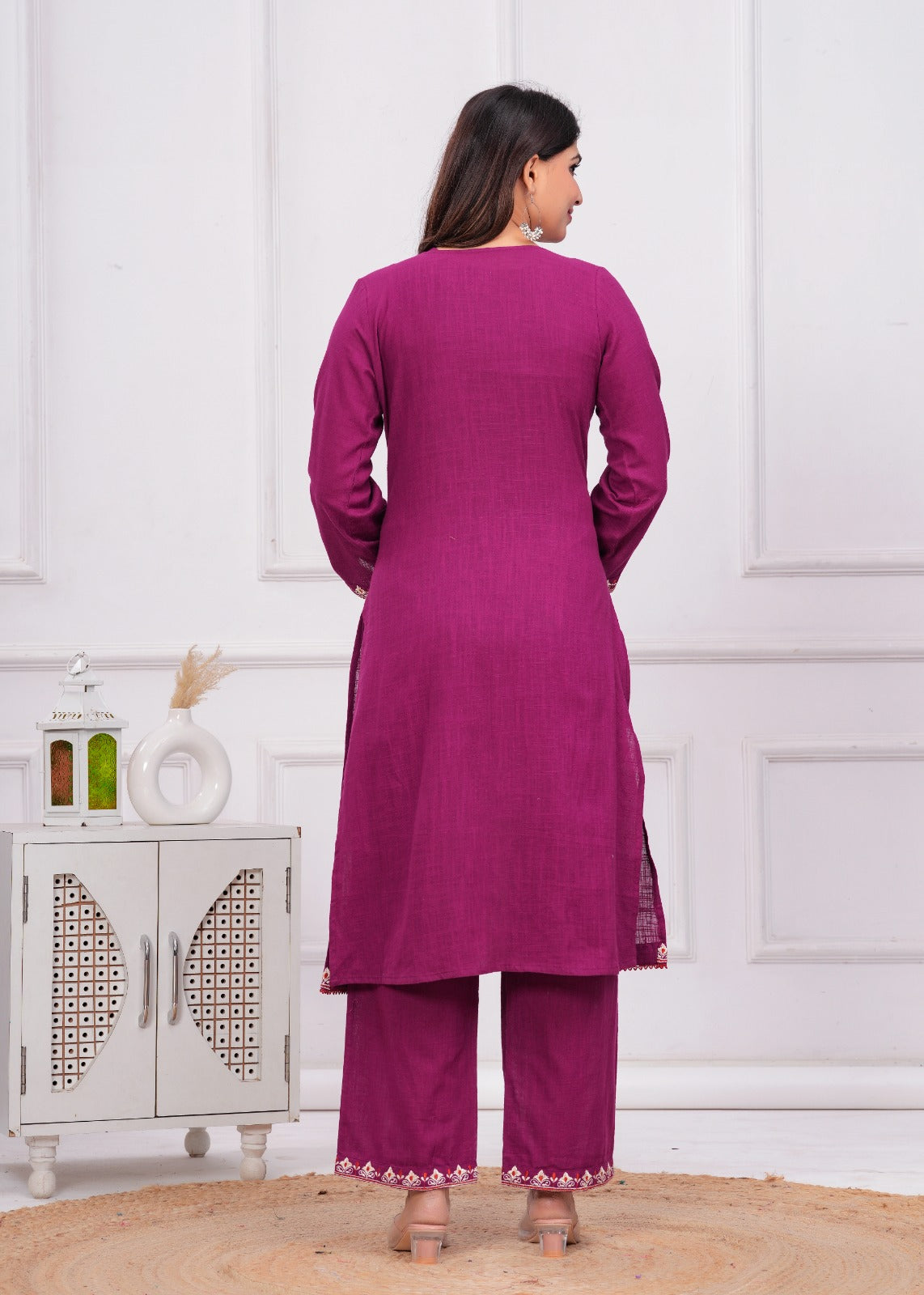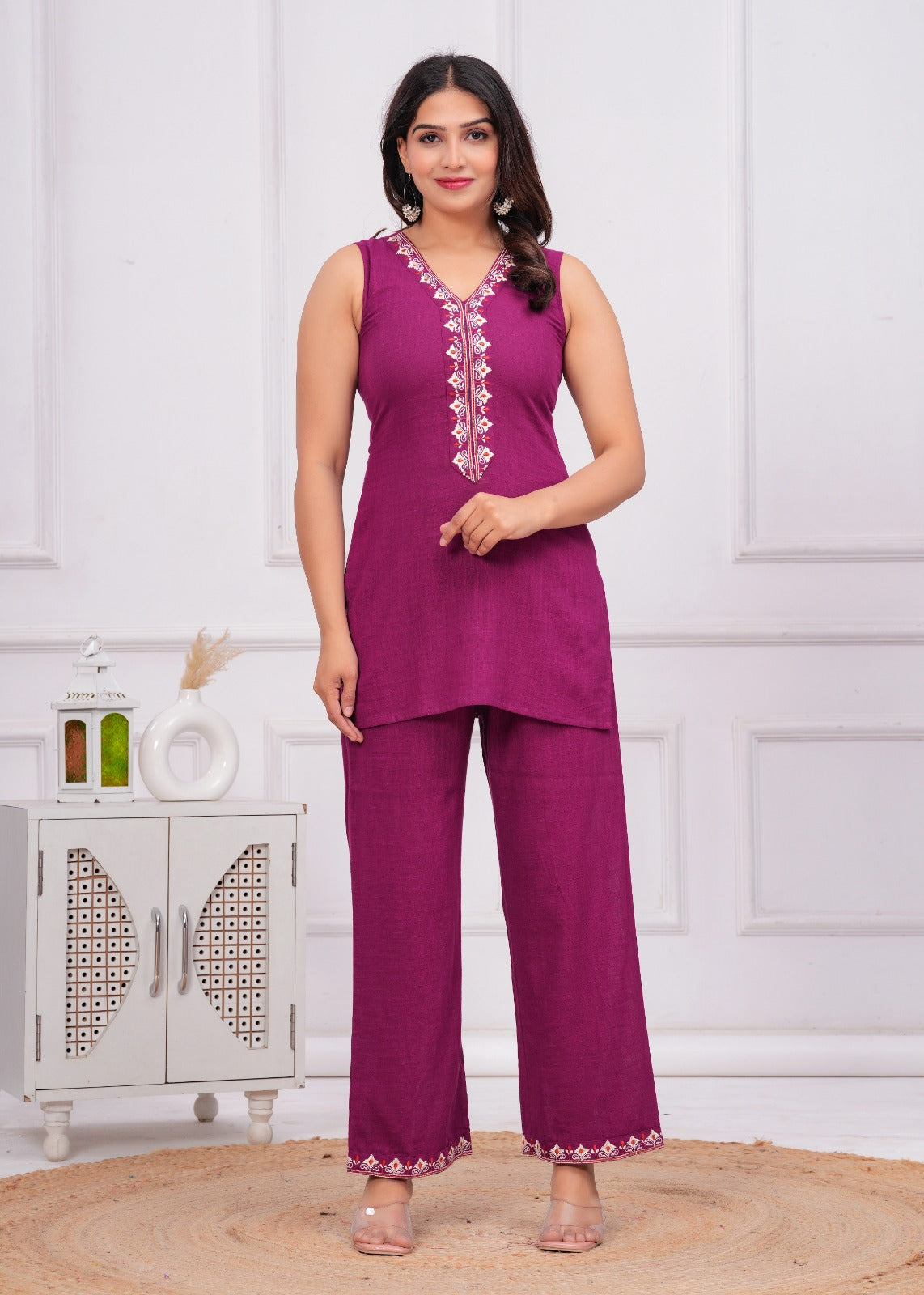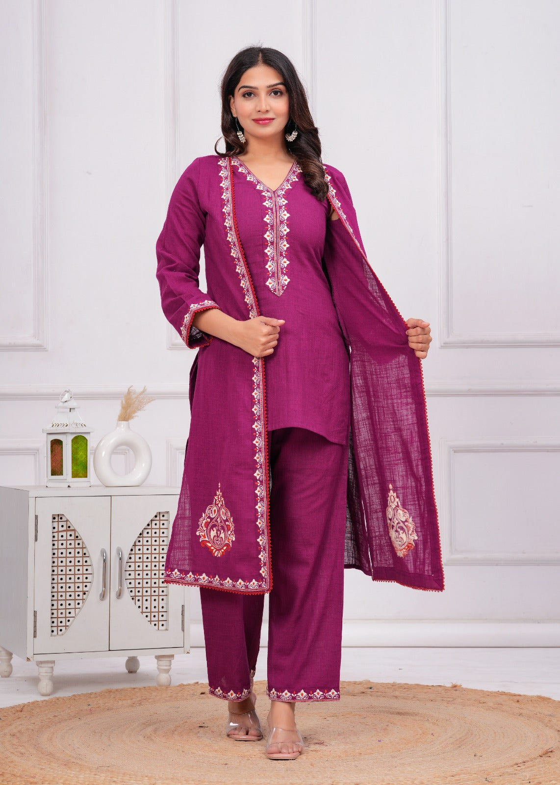 Elevate your look with this captivating Three-Piece Wine Ensemble, designed for a sophisticated, layered style. Crafted from a rich, textured cotton slub fabric, this set is perfect for making a memorable statement at festive gatherings and special occasions. The inner layer features a tailored Straight Short Kurti with a flattering V-Neckline. This is beautifully complemented by solid, comfortable Palazzo Pants that provide a balanced silhouette. The defining piece is the graceful, A-Line Embroidered Long Open Jacket, which cascades elegantly and adds dramatic flair. The jacket, kurti, and palazzo are all adorned with exquisite Ethnic Resham Embroidery featuring intricate thread work motifs along the borders and jacket hems in contrasting shades of red and white, ensuring a highly coordinated and luxuriously detailed finish.